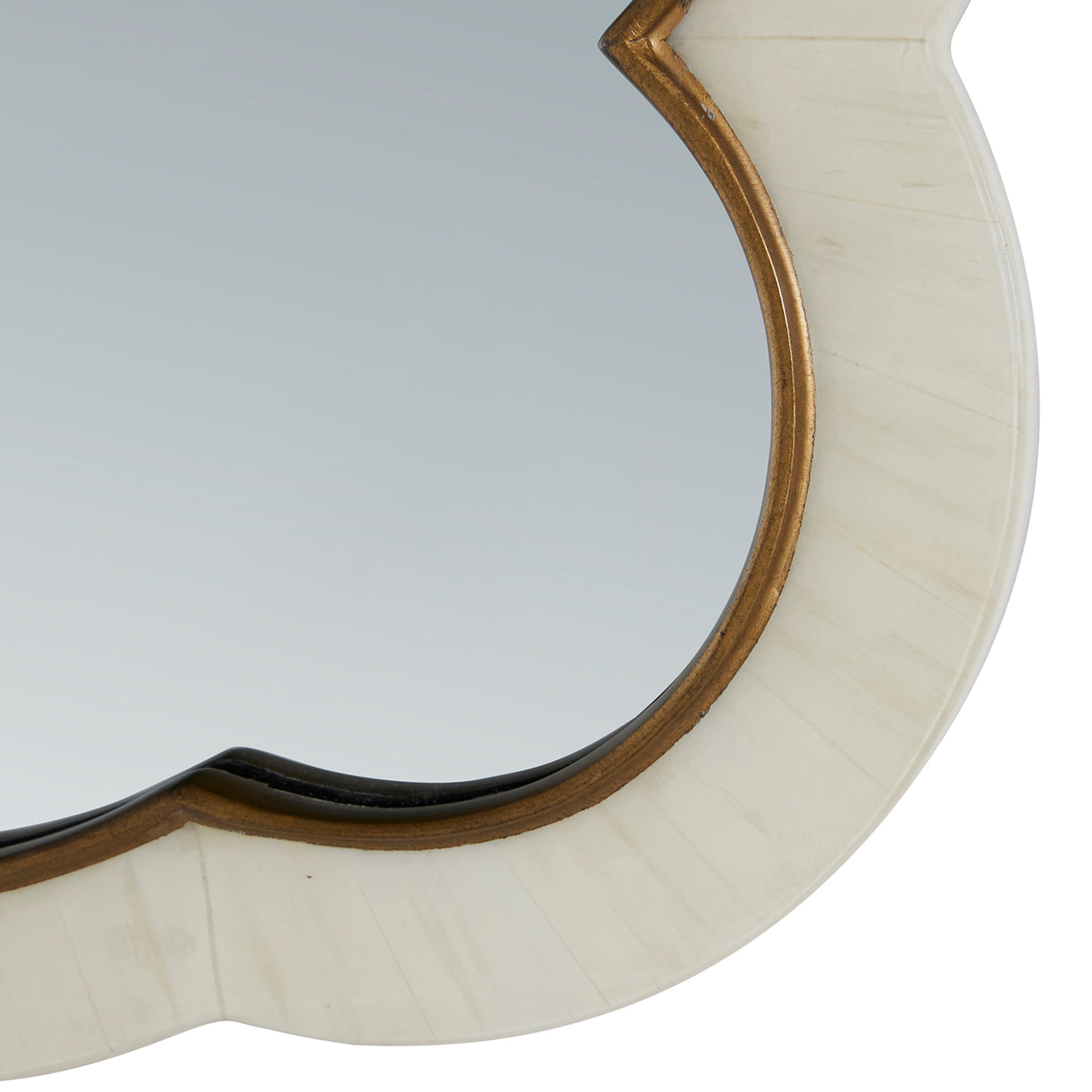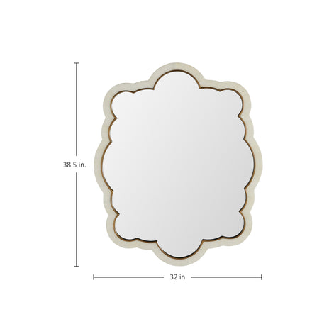 The Rianna Mirror is an eclectic and stunning accent piece, featuring a cloud-shaped frame inlaid with faux white horn and trimmed in an antique brass finish. Its curvy design adds a touch of whimsy and sophistication, making it a fun addition to any room. Whether placed in an entryway, living room, or bedroom, the Rianna Mirror enhances your décor with its unique and elegant style. The high-quality craftsmanship and distinctive materials make this mirror a standout piece in any home.