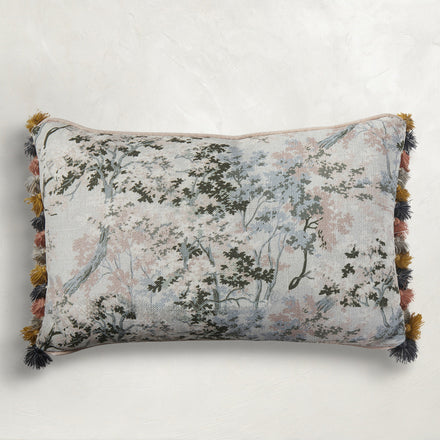 The Thicket Ivy Pillow features a lush, nature-inspired design with rich green and earthy tones, reminiscent of a tranquil forest. Accented with tassels, this pillow brings an organic, serene touch to your decor. Proudly made in the USA, our Gabby pillows are expertly handwoven by skilled American craftsmen. Offering stain-resistant fabrics and available in various sizes, these pillows come with either luxurious feather-down or hypoallergenic poly-fiber fill. Designed for both beauty and practicality, Gabby pillows add comfort and style to any space.