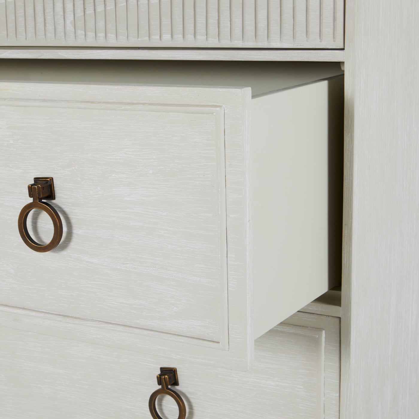 - Cerused white finish highlights the wood grain while adding a soft, elevated touch to any room