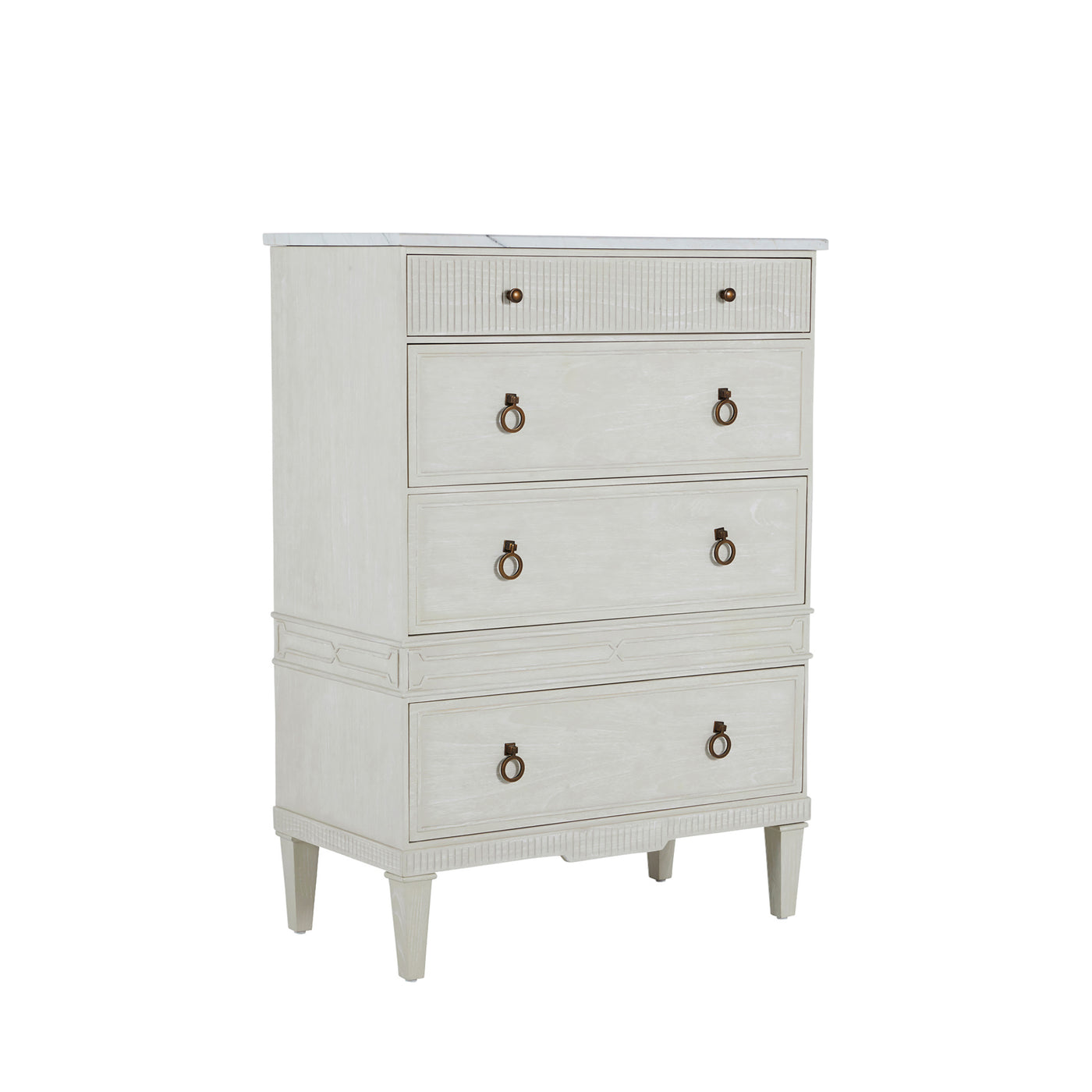 The Archie Tallboy is a sophisticated and stylish storage solution that combines functionality with timeless design. Crafted from durable mindi and Sungkai wood, this tallboy features a beautiful cerused white finish that enhances the natural wood grain and adds a touch of elegance. The standout feature of this piece is the Agros Marble tabletop, renowned for its exquisite veining and durability. The Archie Tallboy is equipped with spacious drawers, each adorned with antique bronze-finished metal pulls that add a vintage touch to the overall design. Its ample storage capacity and elegant aesthetic make it an ideal choice for bedrooms, living rooms, or any space that requires both style and functionality.
