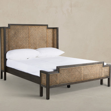 The Camille Bed introduces Gabby's first foray into cane furniture design, bringing a fresh and airy aesthetic to the bedroom. Framed in shaped wood with rich, natural rattan panels, this bed exudes relaxed sophistication. The winged headboard and footboard add a cozy, enclosed feel, perfect for both casual and elevated décors. Its transitional style makes it a versatile piece that complements various interior themes. Available in both Queen and King sizes, the Camille Bed blends wood, mahogany, and metal accents with a beautiful cerused dark Gray finish, pairing seamlessly with the light, textured natural rattan for an inviting bedroom centerpiece.