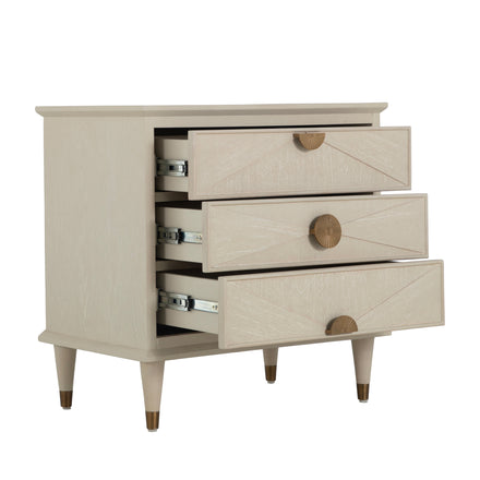 The Emberly Nightstand offers a unique blend of modern design and classic elegance. Finished in a sophisticated cerused white, this nightstand is crafted from high-quality mindy wood and oak veneer, accented with metal details. It features three spacious drawers, providing generous storage space for your bedside essentials. The metal geometric-patterned drawer fronts, in a stylish and detailed round design, adds a touch of contemporary flair, making the Emberly Nightstand a standout piece in any bedroom decor.