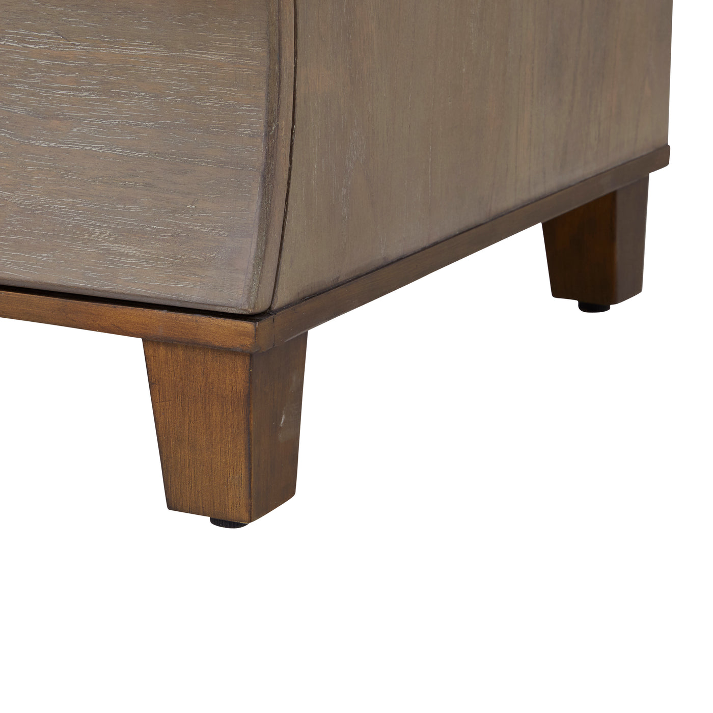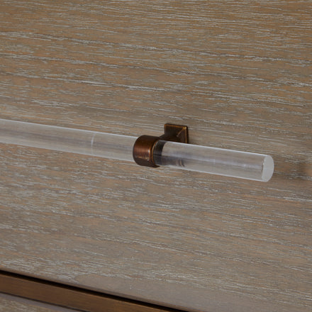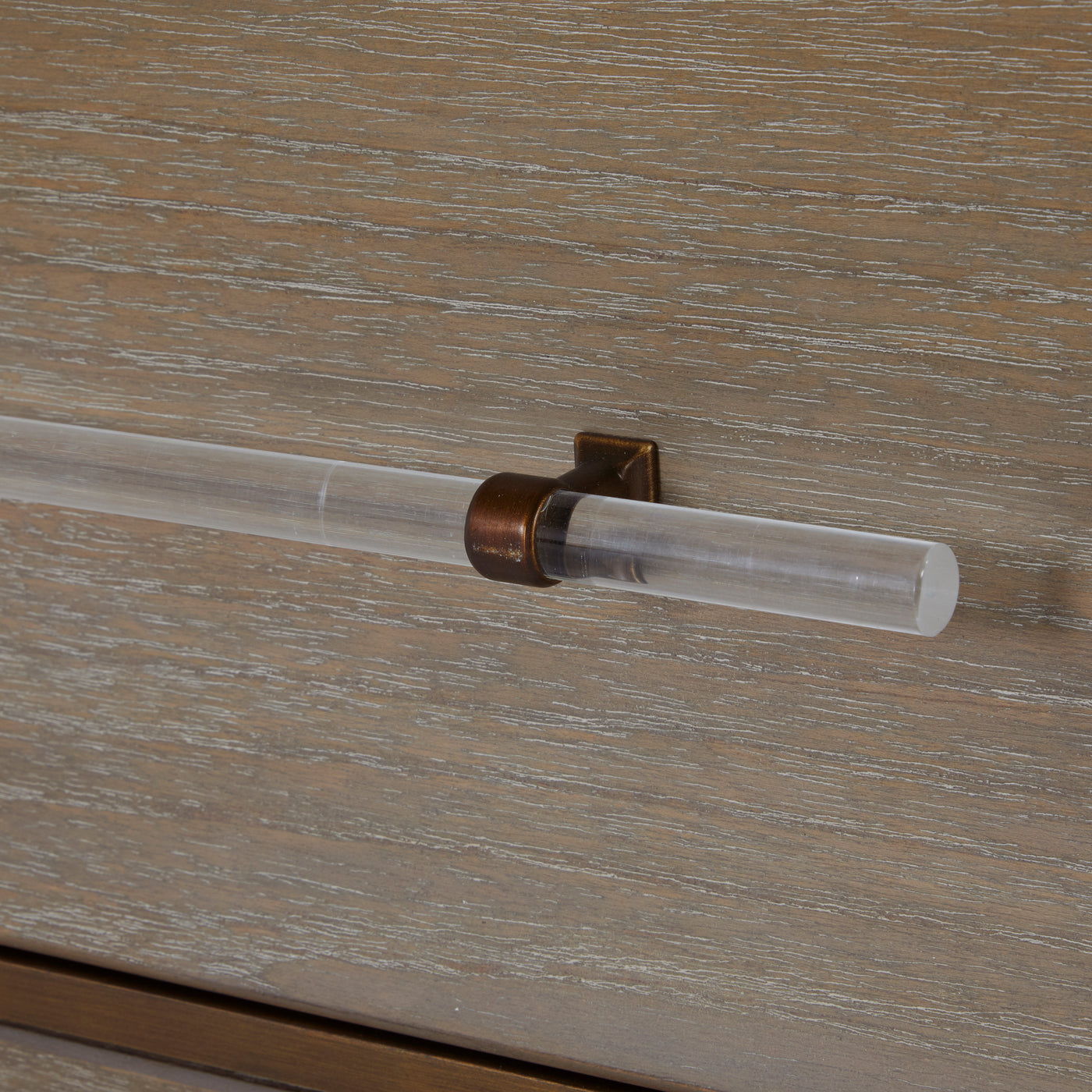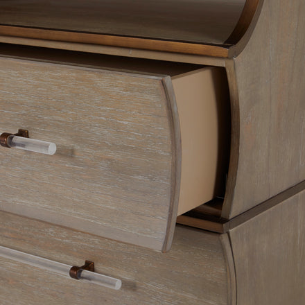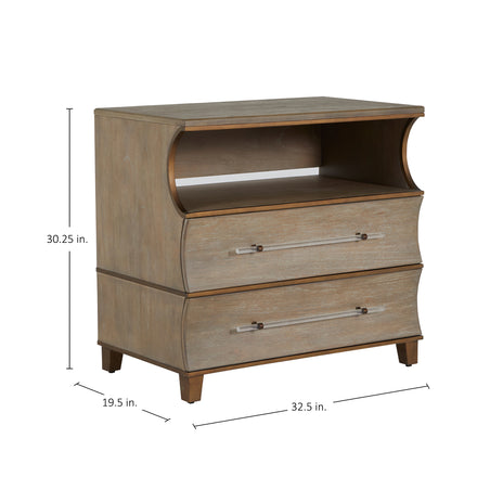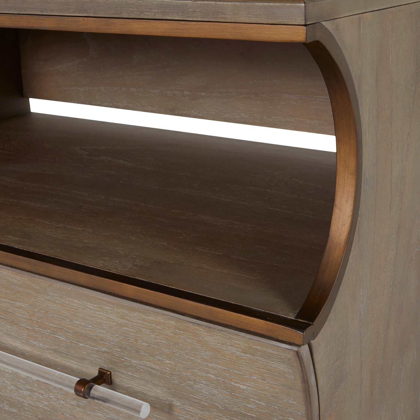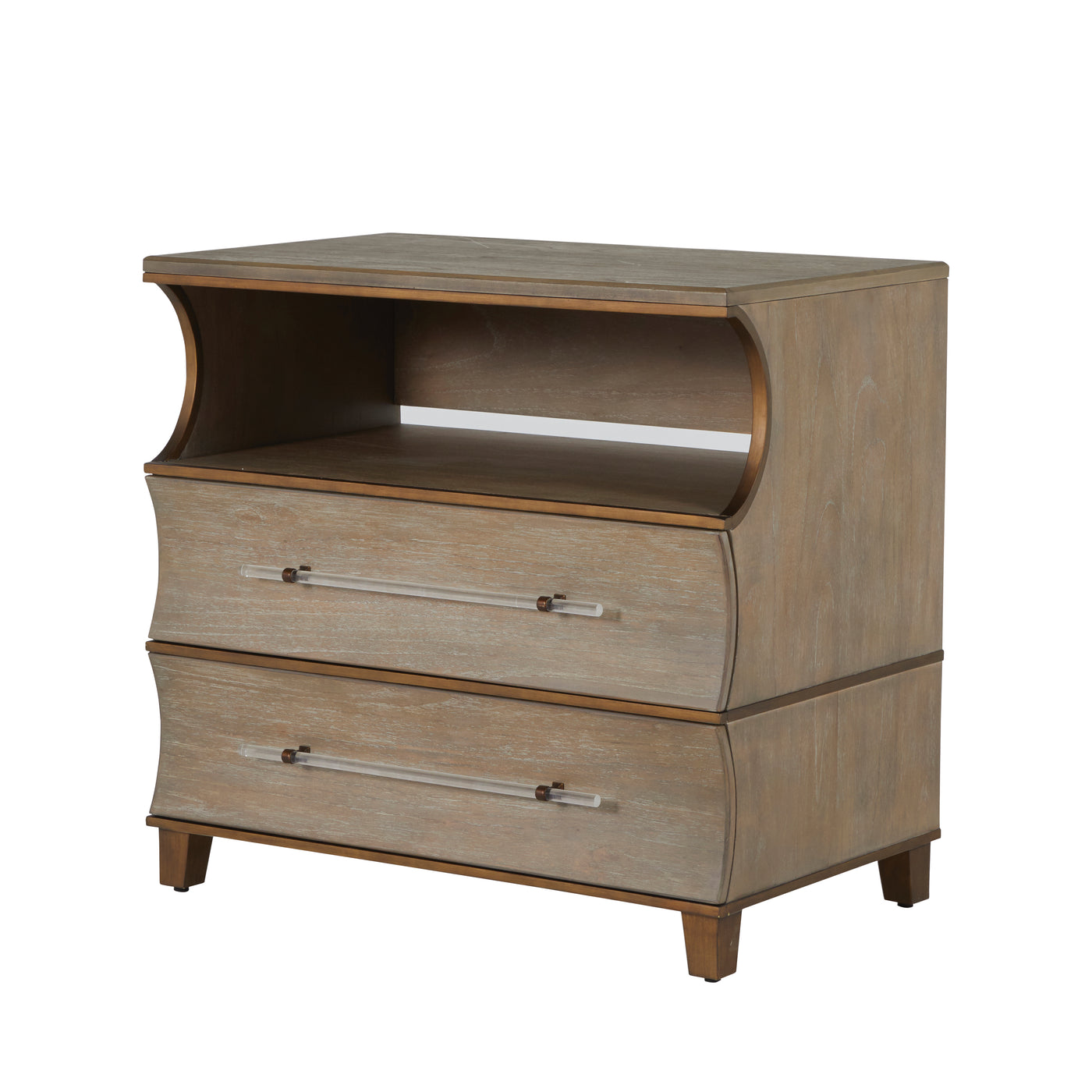 Embracing a textured harmony of materials, our Evonne Nightstand is an adaptable furniture piece for many bedroom aesthetics. The warm cerused natural Gray finish on the wood and acrylic handles upon the antique bronze drawer pulls creates a unique symphony of materials. The nightstand holds space for four separate levels of storage, with one being on top, one open shelf and two pull-out drawers below, allowing an ample amount of storage space for the footage of this nightstand. The graceful geometric curves and small brass details along the facade of the piece make this nightstand even more intriguing. Please note that this product uses natural materials and differences in color and pattern should be expected.