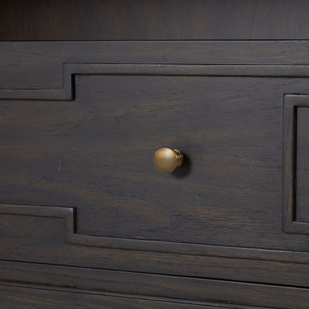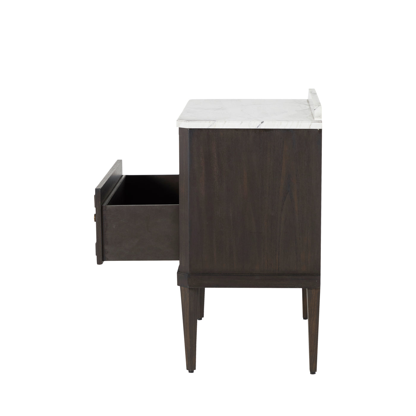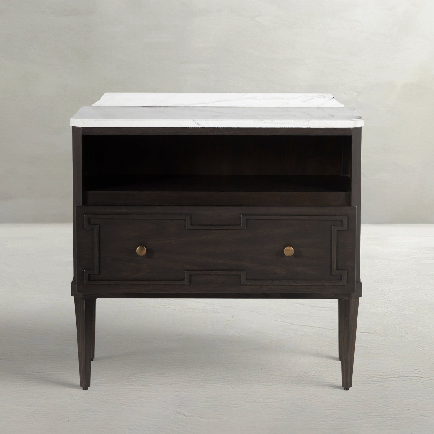This smaller scale nightstand features Gustavian-inspired molding with elegant angles and thin legs. Historically, the raised backing served as a decoration and a block to prevent objects from sliding to the back. Available in two finishes, a warm Cerused natural brown finish and a more modern Cerused Brown version with a marble top. The marble features natural characteristics, differences in each piece of stone are to be expected. Features undermount soft-close drawer glides.