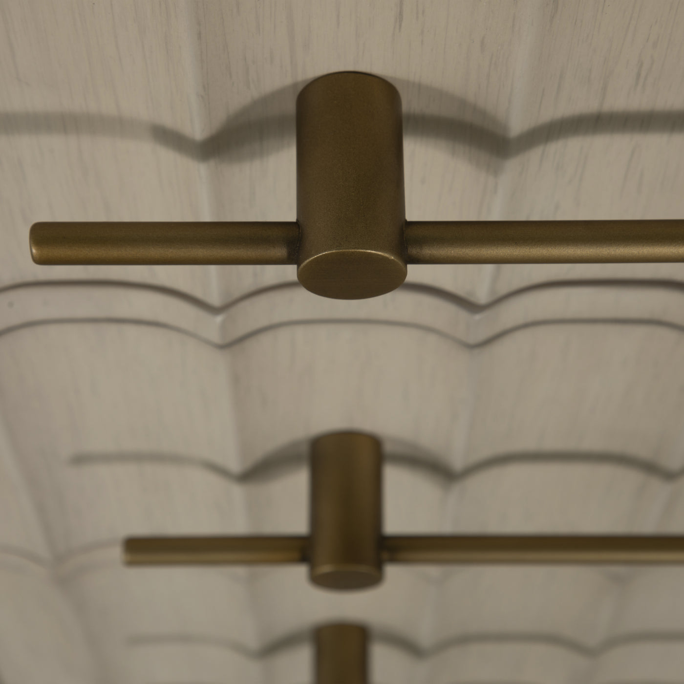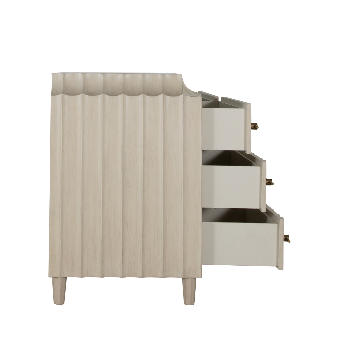 - Brushed gold linear hardware spans each drawer, blending function with refined contemporary detail