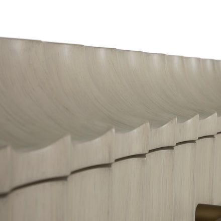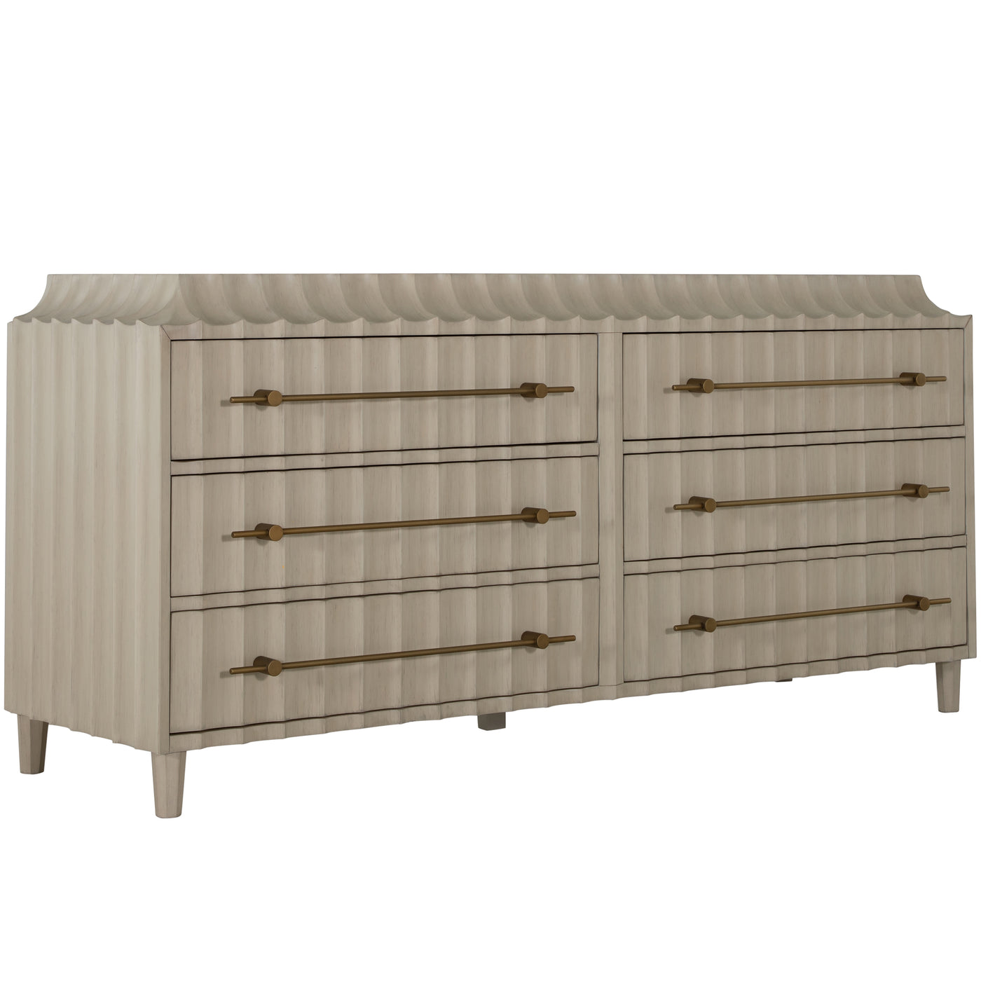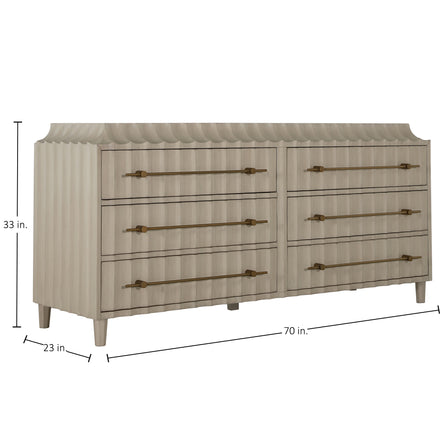 The Merigold Dresser, accompanying the Merigold Chest, is a bold statement piece that transforms a traditional dresser silhouette with its exaggerated modern sculpting in a textured white on the front and sides. Enhanced by brushed gold linear hardware that extends across the length of each drawer, it strikes a perfect balance between classic and contemporary. A subtle contoured arch around the top adds an elegant touch, while its width, double that of the chest, provides ample storage space. This dresser is designed for those seeking a striking, functional piece that commands attention in any room.