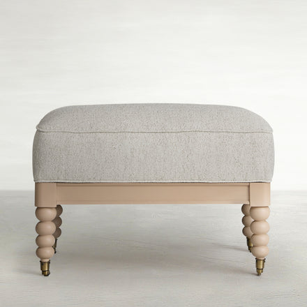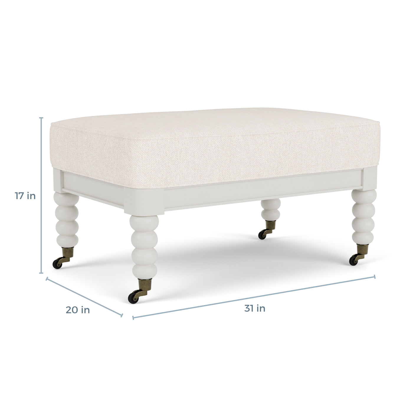 The Pierce Ottoman is the perfect companion for the Pierce Chair, featuring the same boxed cushion styling and spool-design legs. Its compact and versatile design makes it a great addition to any living space, providing extra seating or a comfortable footrest. The metal casters ensure easy repositioning, adding to its functionality. The Pierce Ottoman combines classic design with modern convenience, making it a stylish and practical piece for your home. Hand-painted and upholstered in North Carolina.