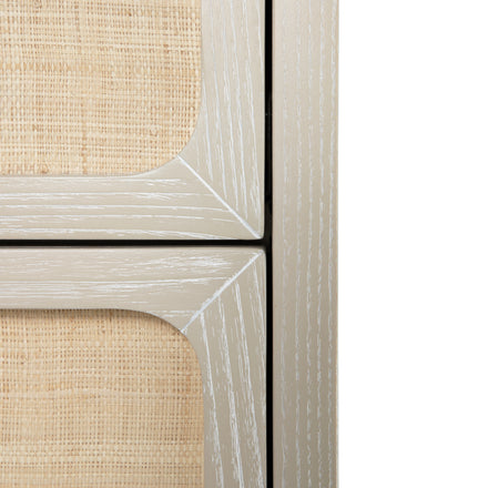 The Serini Nightstand is a transitional masterpiece, embracing natural materials for its drawer insets and sides. This unique piece forgoes traditional hardware, opting for ingeniously designed natural grips on each of its three uniformly sized drawers. Its cerused white finish adds a touch of timeless elegance, ensuring it fits seamlessly into any bedroom decor while highlighting its commitment to simplicity and the beauty of nature.