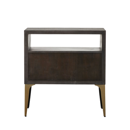 The Westville Nightstand stands tall and stately with its slim stained brass legs and dark Gray burl finish. Featuring two spaceous drawers and an open shelf, this nightstand is the perfect bedside companion for higher beds. Its sophisticated design and practical storage make it a stylish and functional addition to any bedroom. The elegant combination of materials and refined details ensures it complements various decor styles while providing essential storage.