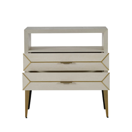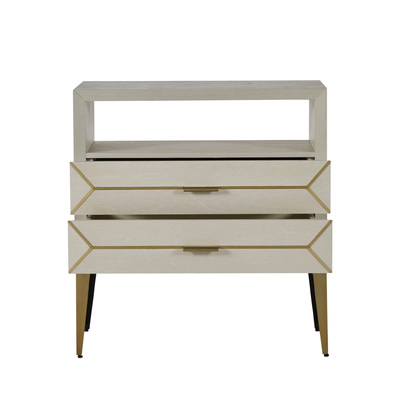 The Whitley Nightstand exudes elegance with its slim stained brass legs and cerused white finish. Featuring spaceous drawers and an open shelf, this nightstand is the perfect bedside companion. Its sophisticated design and practical storage make it a stylish and functional addition to any bedroom. The refined aesthetic and luxurious materials ensure it complements various decor styles, adding both functionality and charm to your space.