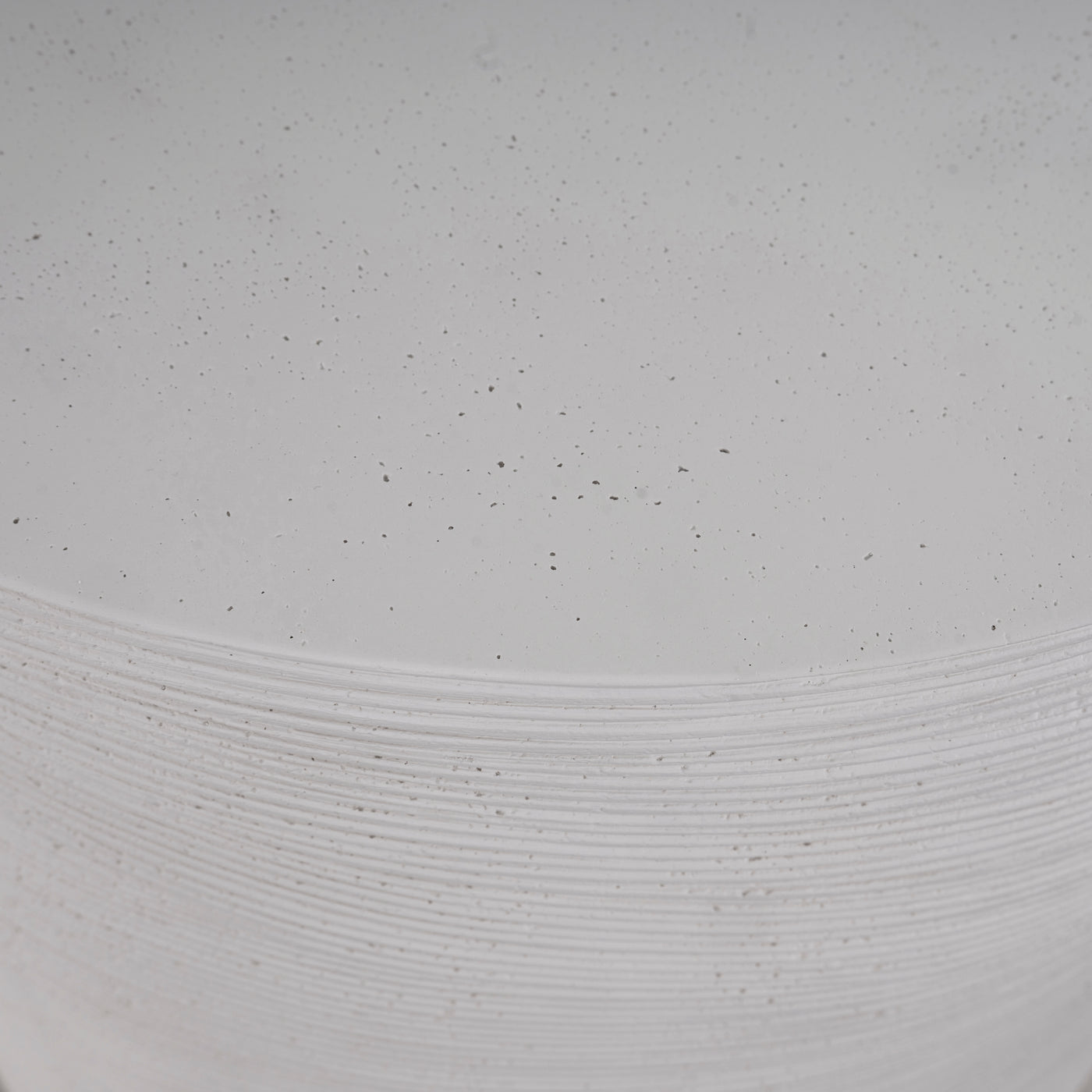 A feathery ribbed pattern encircles the Caraway Side Table, giving a pleasing texture to the circular table's cast stone base. The table is finished in a natural white hue that allows it to coordinate with a multitude of decorative styles.