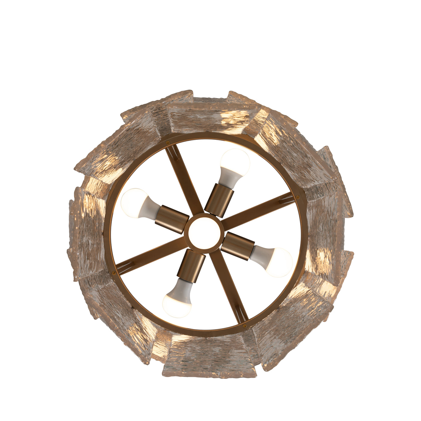The Augusta Chandelier, a style extension of the Augusta Flush Mount, showcases a captivating design with textured cast glass panels that elegantly surround the light source. The glass panels diffuse light beautifully, creating a soft, ambient glow while allowing a generous amount of illumination to shine through underneath. The chandelier is enhanced with antique brass accents, adding a touch of luxury and sophistication to its striking aesthetic. Perfect for modern and contemporary spaces, the Augusta Chandelier serves as both a functional light source and a refined statement piece, elevating any room with its blend of elegance and warmth.