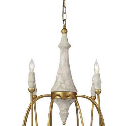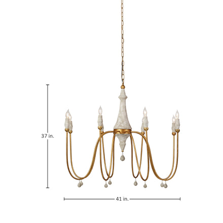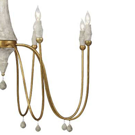 Inspired by french antiques and mid-century modern design, the Clay Chandelier combines classic and contemporary elements. Featuring a turned wood center column with a distressed ivory finish and six smooth and elaborately curved vintage gold finished arms, the chandelier is a true blend of eras. Unique candle-style lights in antique-style distreed ivory holders and delicate distressed ivory teardrop accents add a touch of vintage charm. This chandelier brings a warm, inviting glow to any space, bringing any room gentle illumination.