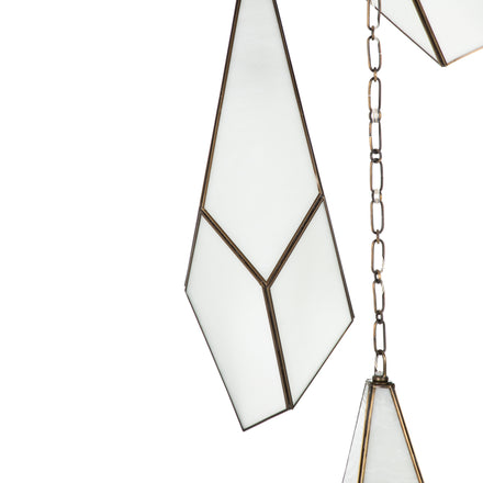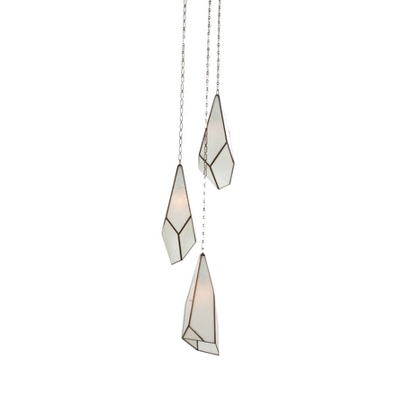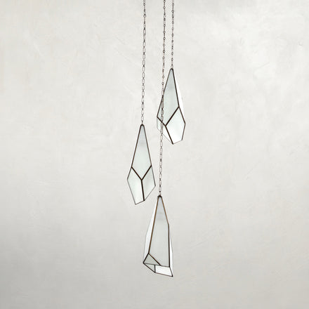 - Three geometric glass pendants suspended at varied lengths for a dynamic and layered lighting effect