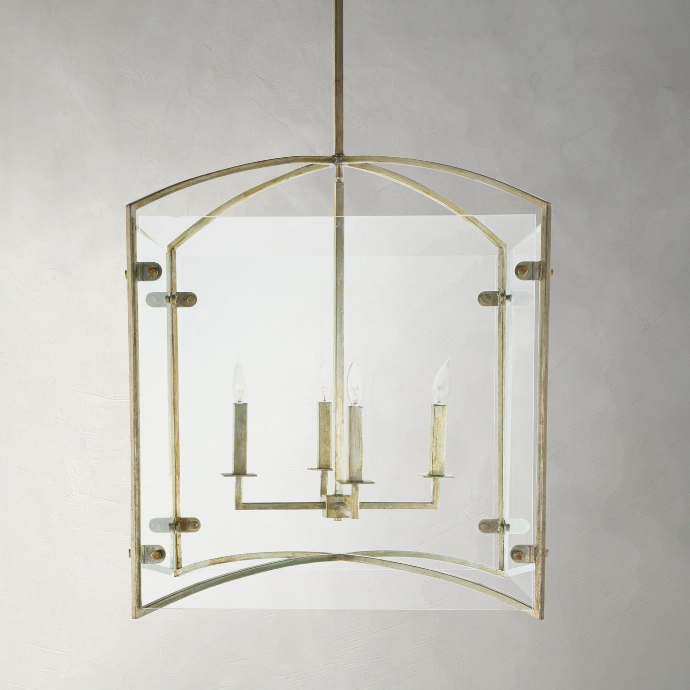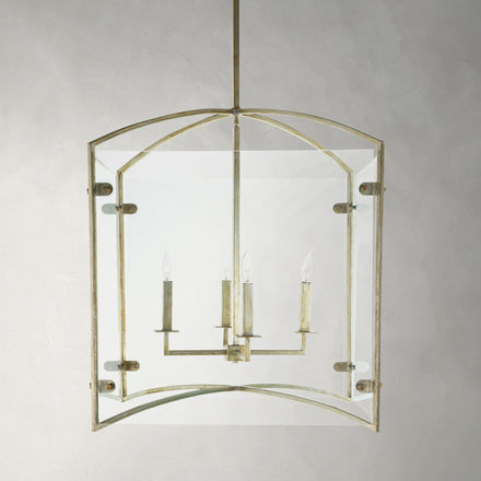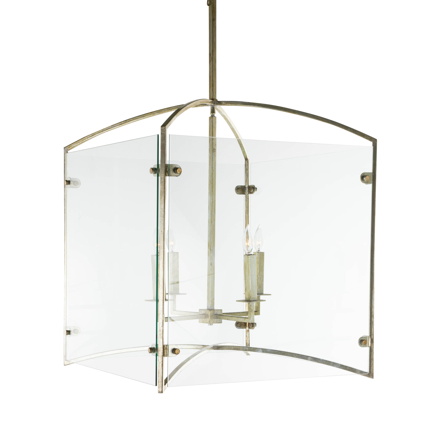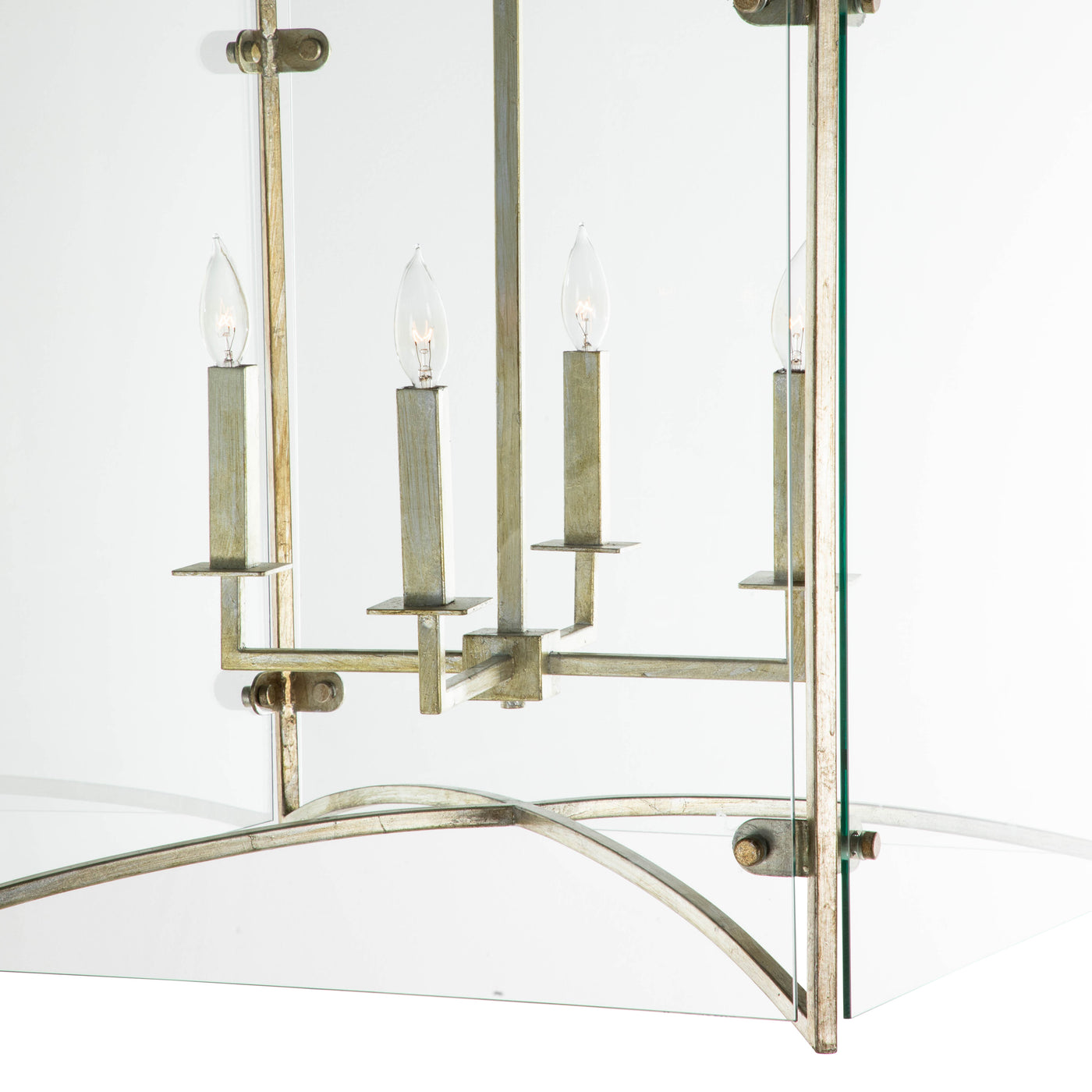 - Tempered glass panels encase candle-style lights, offering a soft glow while enhancing the chandelier’s sophisticated profile