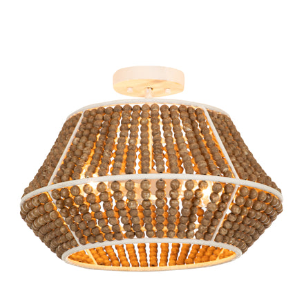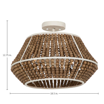 The Gilmer Semi-Flush Mount is a charming lighting fixture that brings a touch of rustic elegance to any room. This semi-flush mount features an array of wooden beads, each hand-finished in a beige washed wood, arranged in a gracefully draped fashion. The metal frame and mounting hardware are coated in a sleek white plaster finish, creating a beautiful contrast with the natural wood tones. The combination of materials and finishes gives the Gilmer Semi-Flush Mount a versatile aesthetic, perfect for both modern and traditional interiors. This light fixture not only provides ample illumination but also serves as a stylish decorative piece.