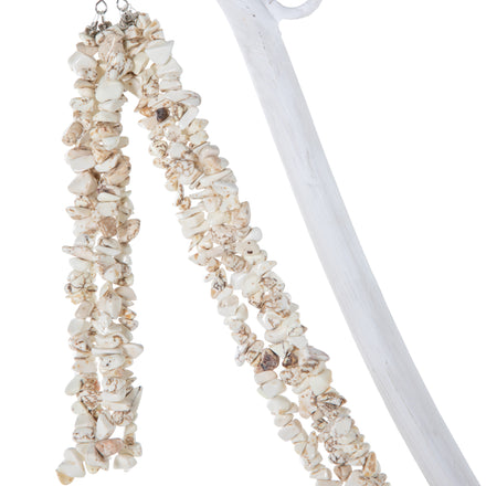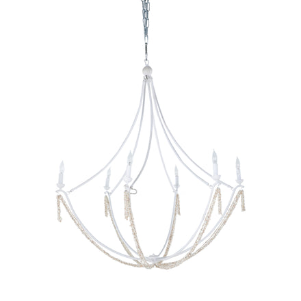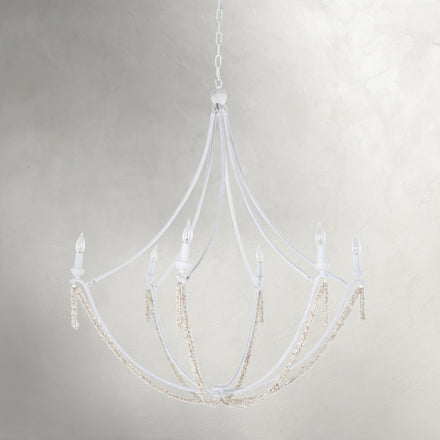 The Nakita Chandelier features an antique white-washed metal finish that beautifully complements coastal-themed decors. This large elegant lighting fixture is adorned with gracefully draped white pebble stones, adding a touch of sophistication and charm. The candle-like light bulbs enhance its classic appeal, making it an ideal centerpiece for dining rooms, living areas, or grand entryways. The combination of the antique white colorway and delicate stones provides a serene and minimalist aesthetic, perfect for creating a relaxed and inviting atmosphere.