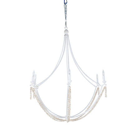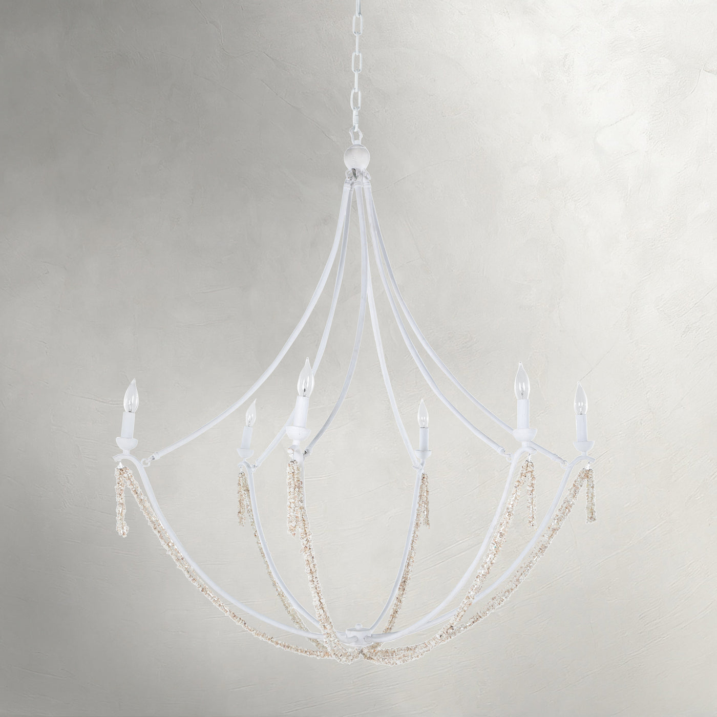 - Draped with elegant white pebble stones that add texture, sophistication, and visual interest to the chandelier’s silhouette