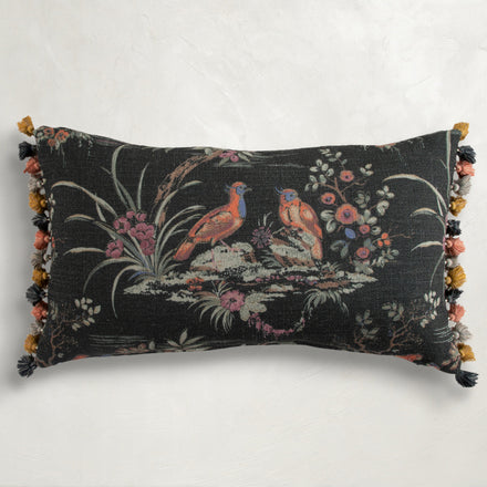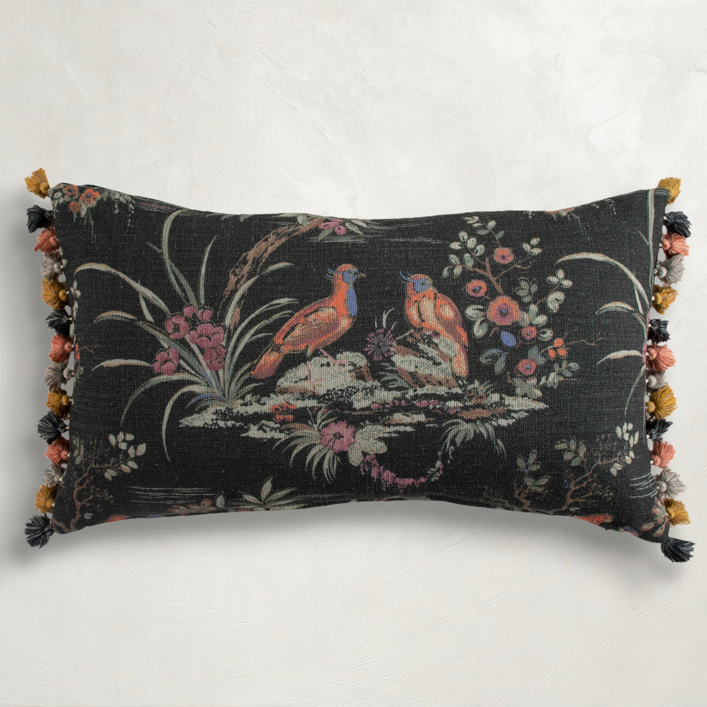 The Fiji Sorbet Pillow blends exotic and traditional interests into one, bringing a vibrant depiction of tropical birds and lush foliage to a vintage toile display. Edged with colorful tassels, this pillow adds a whimsical yet sophisticated element to your decor. Available with either hypoallergenic poly-fiber or luxurious feather-down fill, it combines comfort with style. Proudly made in the USA, Gabby pillows are expertly handwoven by skilled American craftsmen, offering stain-resistant finishes and available in various sizes. These pillows add both beauty and practicality to any space.