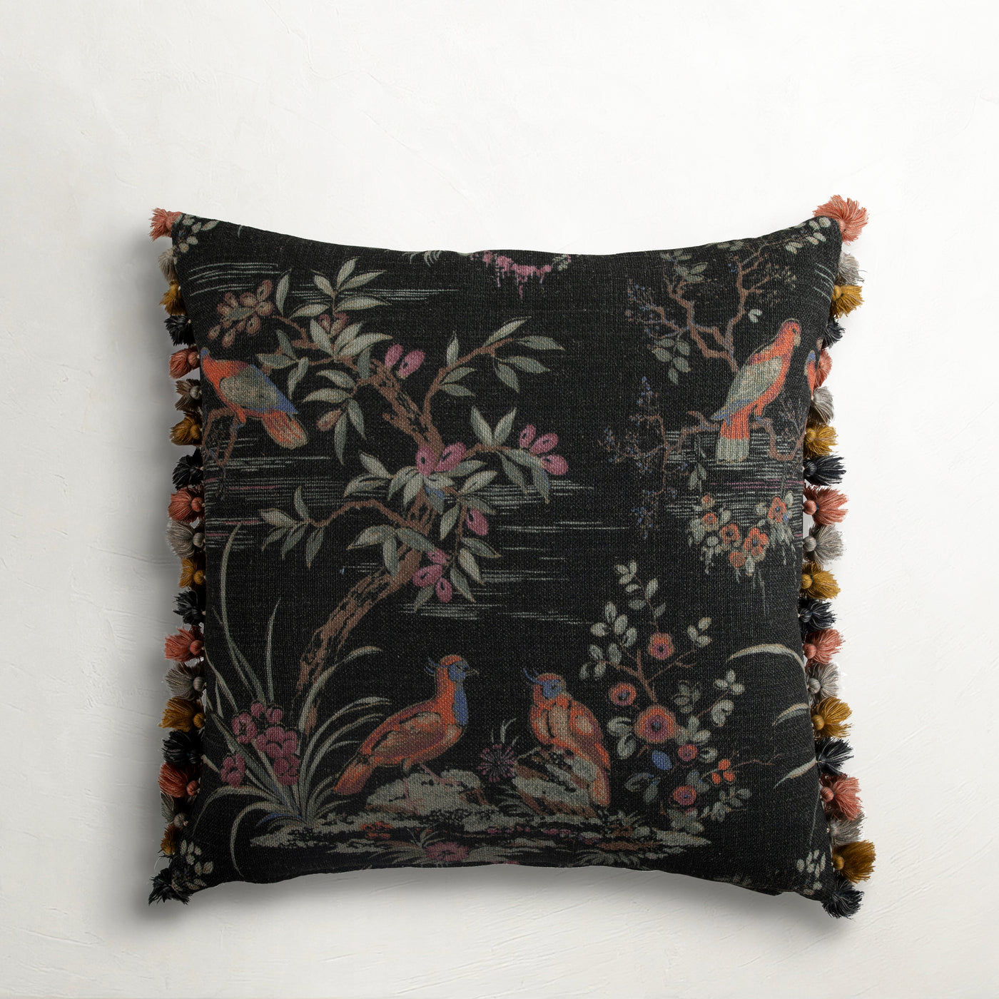 The Fiji Sorbet Pillow blends exotic and traditional interests into one, bringing a vibrant depiction of tropical birds and lush foliage to a vintage toile display. Edged with colorful tassels, this pillow adds a whimsical yet sophisticated element to your decor. Available with either hypoallergenic poly-fiber or luxurious feather-down fill, it combines comfort with style. Proudly made in the USA, Gabby pillows are expertly handwoven by skilled American craftsmen, offering stain-resistant finishes and available in various sizes. These pillows add both beauty and practicality to any space.
