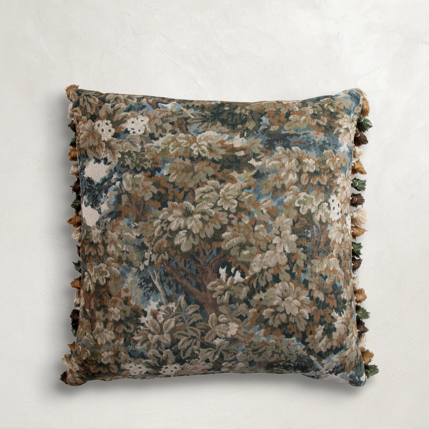 The Flourish Wheat Pillow showcases a lush, woodland-inspired design. The detailed tapestry-like pattern brings a touch of nature indoors, creating a serene and inviting atmosphere. Finished with delicate tassel fringe, this pillow adds texture and sophistication to your décor. Perfect for enhancing the natural beauty of your living space.Proudly made in the USA, our Gabby pillows are expertly handwoven by skilled American craftsmen. Offering stain-resistant finishes and available in various sizes, these pillows come with either luxurious feather-down or hypoallergenic poly-fiber fill. Designed for both beauty and practicality, Gabby pillows add comfort and style to any space.