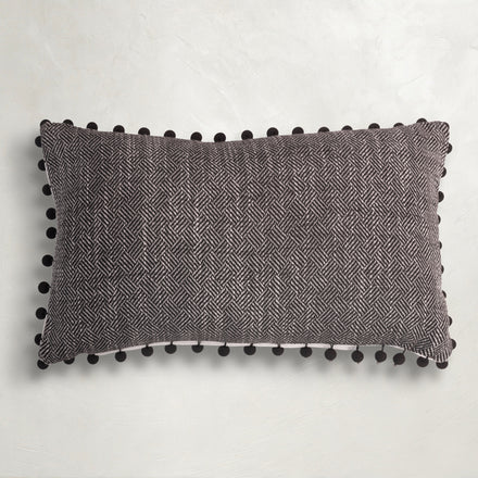 The Hutch Pillow stands out with its rich, dark color and playful black ball tassels. The very textured fabric provides a tactile element, making this pillow a unique and stylish addition to your space.Proudly made in the USA, our Gabby pillows are expertly handwoven by skilled American craftsmen. Offering stain-resistant finishes and available in various sizes, these pillows come with either luxurious feather-down or hypoallergenic poly-fiber fill. Designed for both beauty and practicality, Gabby pillows add comfort and style to any space.