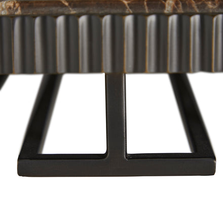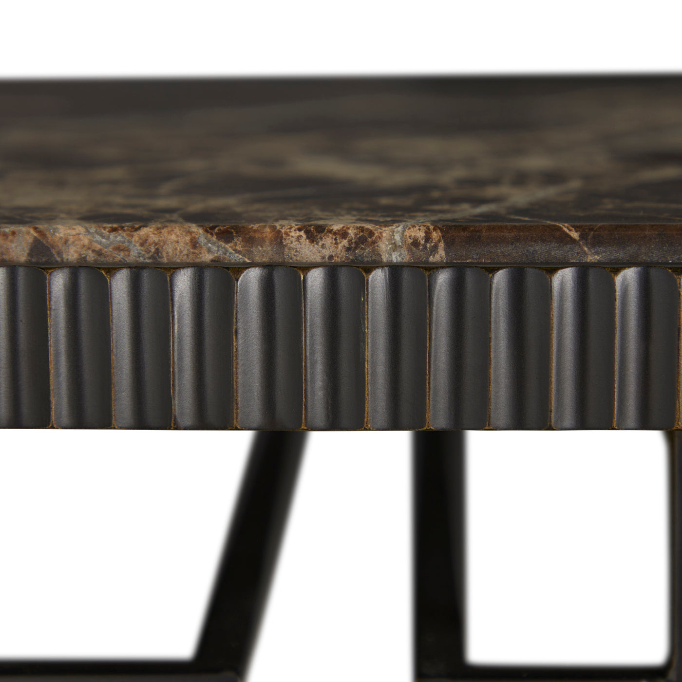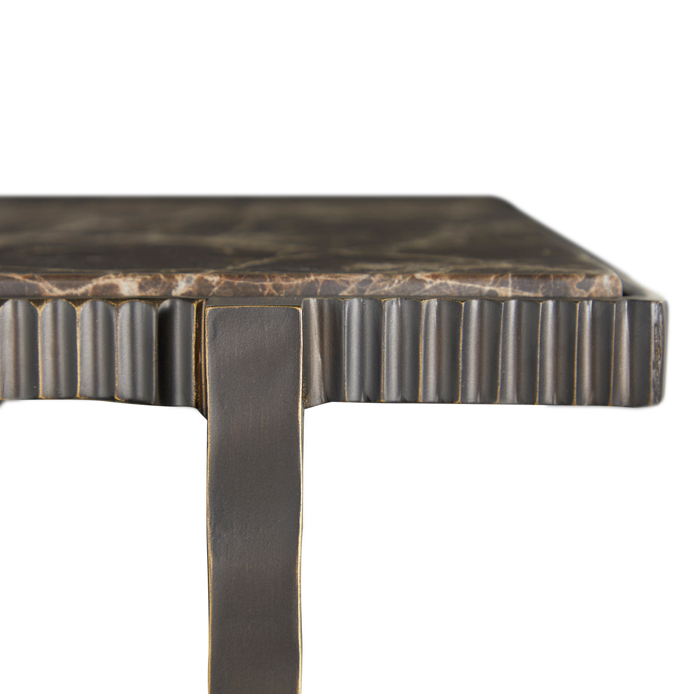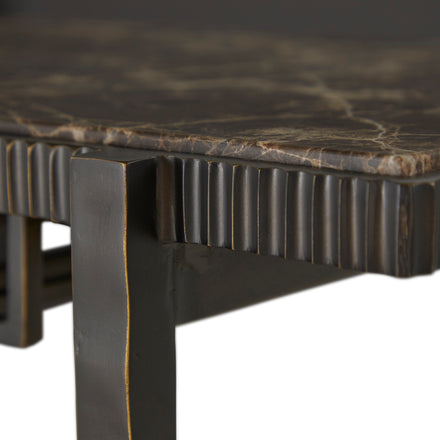 Featuring a sleek Marron Imperial marble top and a forged antique bronze frame, this slender accent bar console exudes timeless sophistication. Designed for both style and utility, the Ariana Bar Console boasts an undercounter glass storage rack, ensuring your stemware is always within reach. Its delicately forged metal details provide a refined touch, while the sturdy yet slender frame allows for seamless integration into any space - whether as a statement piece in your living room or a chic addition to your home bar setup. Perfect for hosting or everyday luxury, this bar console brings simple functionality with a high-end aesthetic, making it an essential piece for connoisseurs of fine design and entertaining.