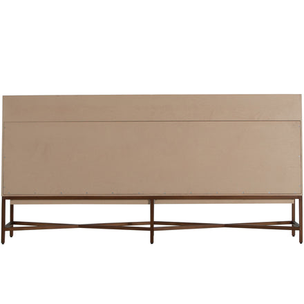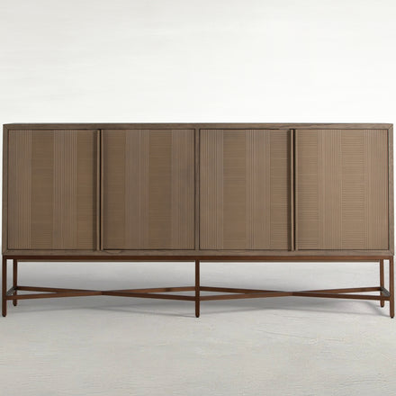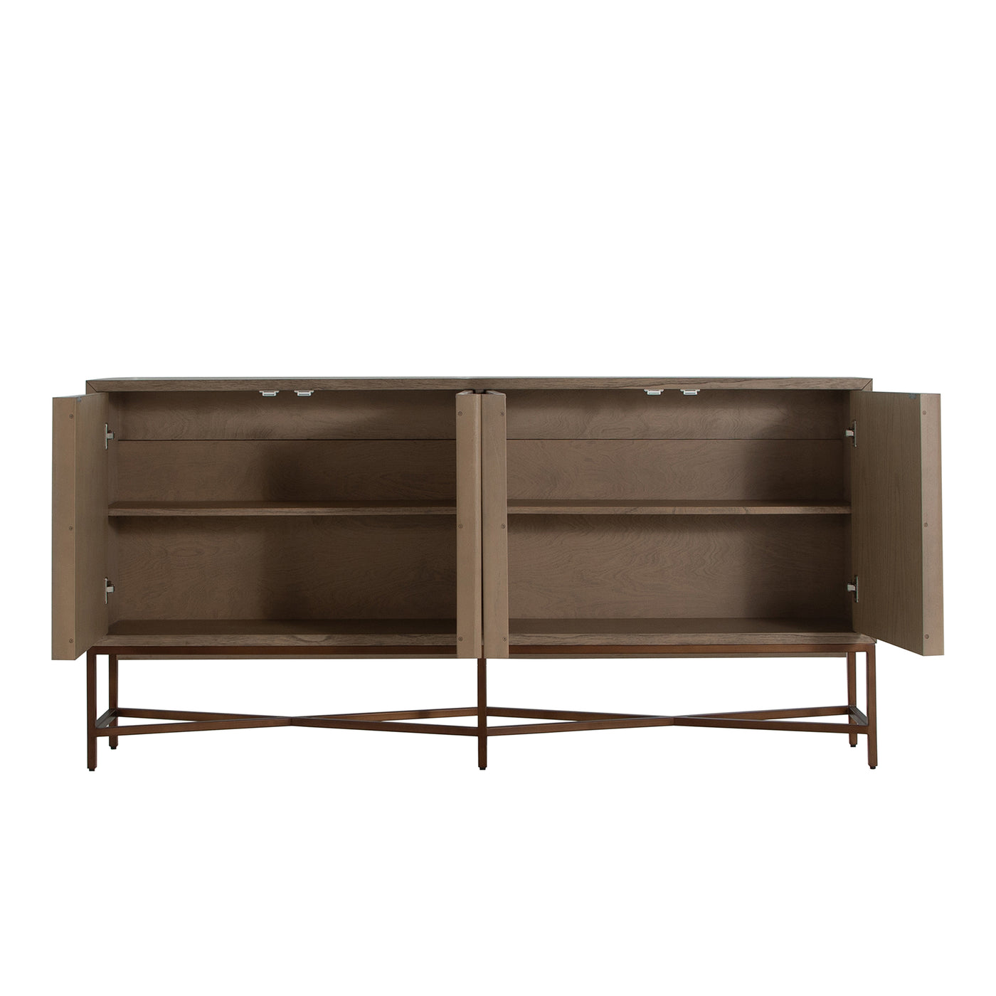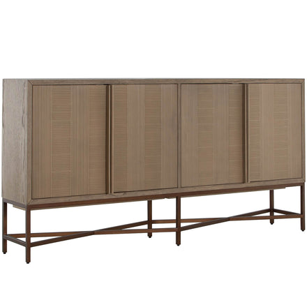 The slim silhouette of the Carol Sideboard makes it an easy fit in a variety of settings. Ribbing in a warp and weft-like pattern brings interesting texture to the natural blonde sideboard. An antique bronze cross-base design adds a touch of glamour, making this piece both chic and sturdy. Perfect for modern or transitional interiors of any room, the Carol Sideboard offers ample storage while enhancing the room's aesthetic appeal.