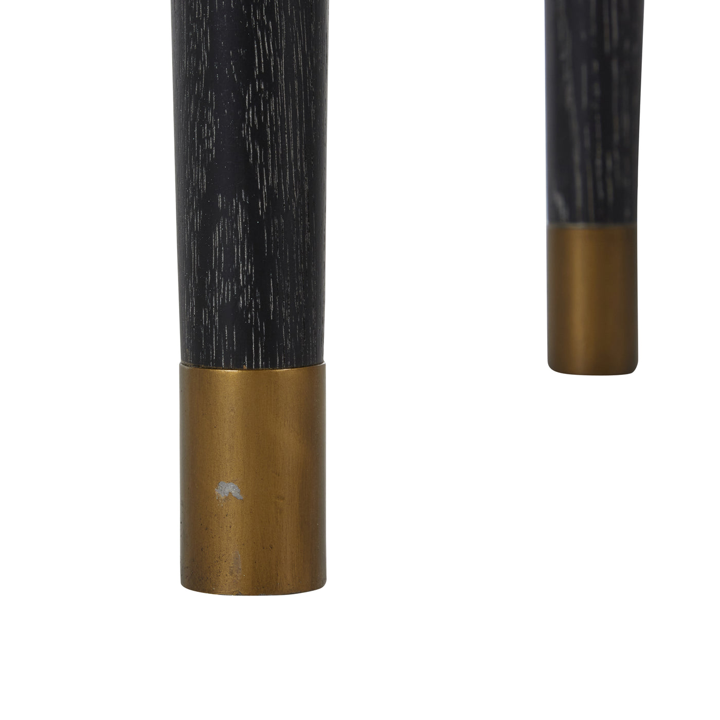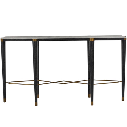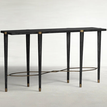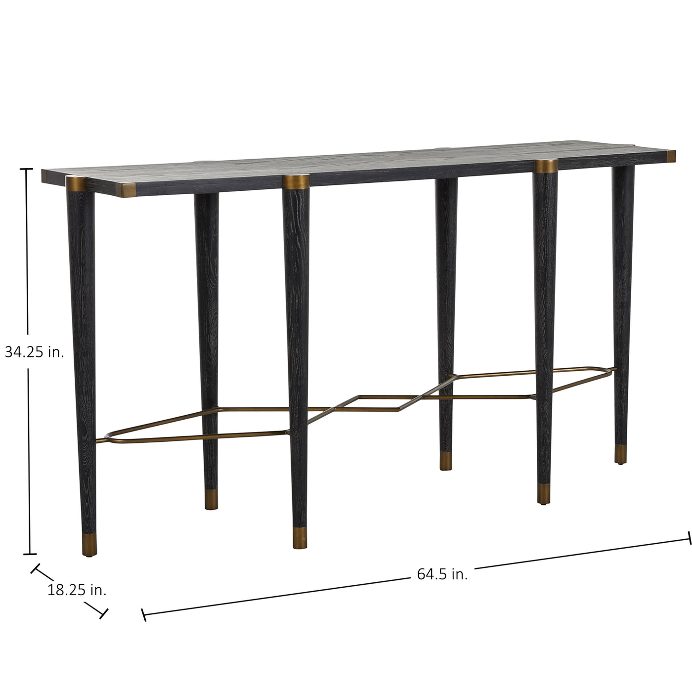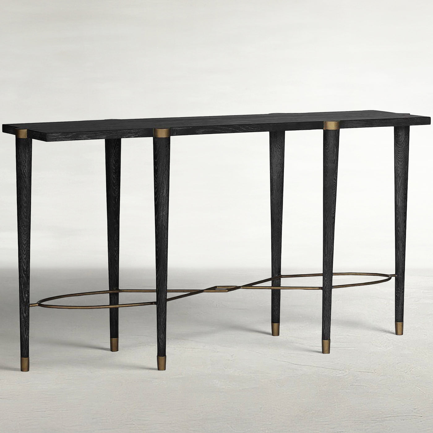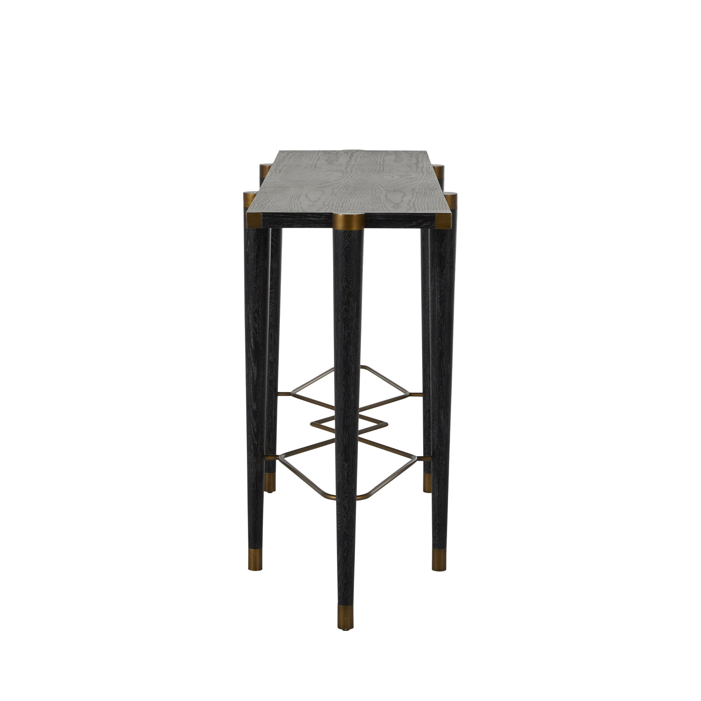 The Fiona Console Table, crafted from black cerused oak, exudes style and sophistication. Antique brass accents and the tapered legs highlight its sleek design, making it a striking piece in any room. Perfect as a hallway piece or sofa console, it seamlessly highlights its artistic form while remaining functional, enhancing your transitional living space.