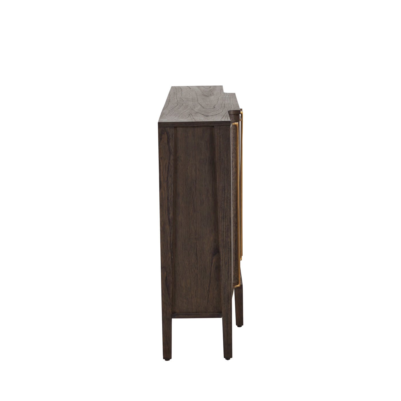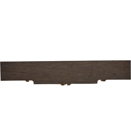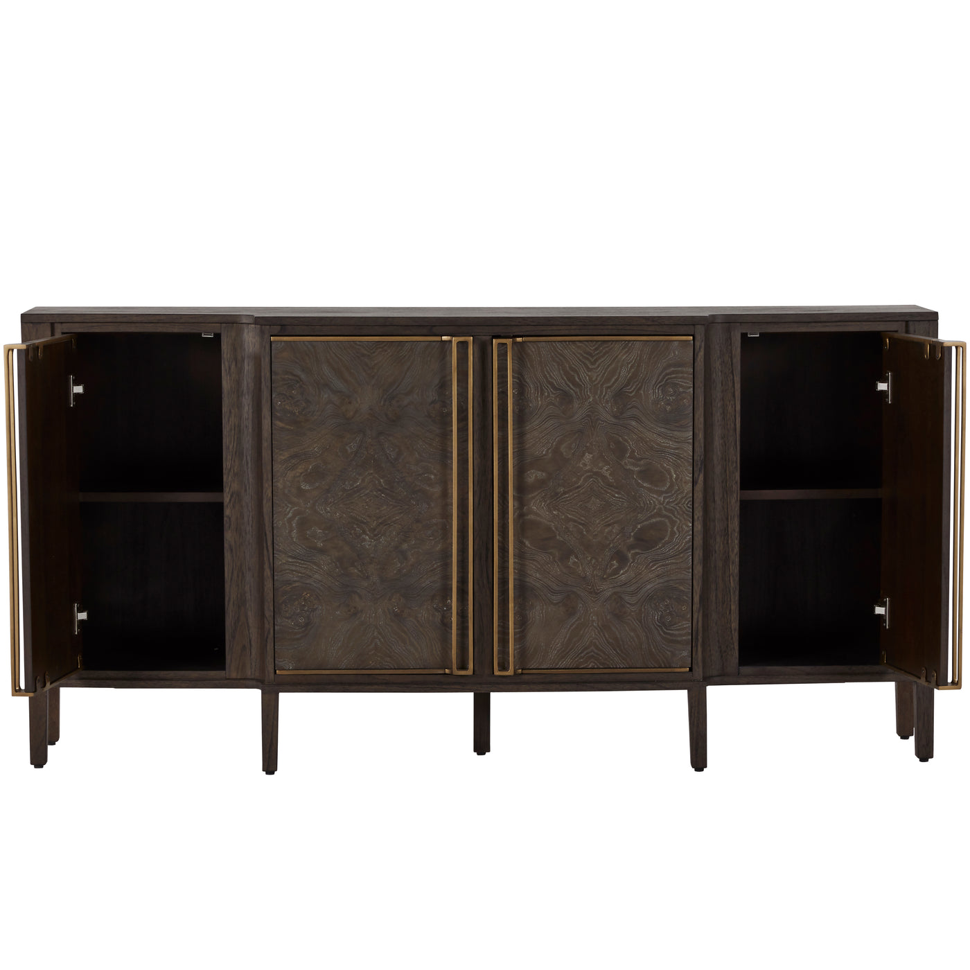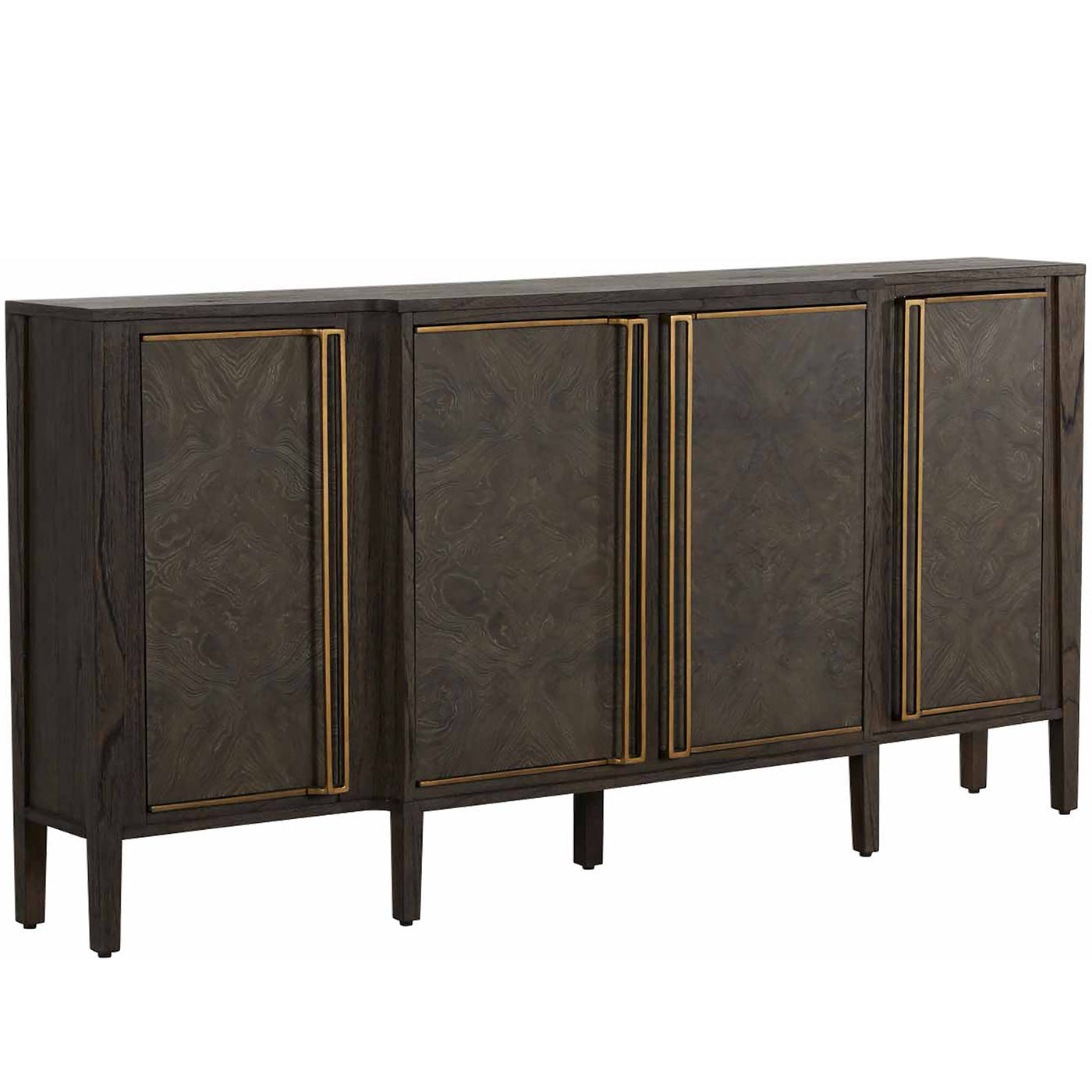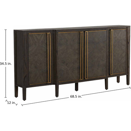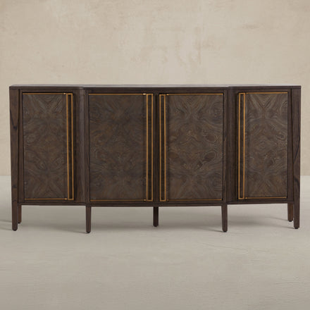 The Fitzgerald Sideboard exudes understated elegance and modern sophistication with its sleek, narrow design. Crafted with meticulous attention to detail, this piece features dark burl tones that showcase a beautiful grain pattern, complemented by sleek, elongated stained brass handles that add a touch of sophistication. The clean lines and minimalist form allow the natural beauty of the burl and mindi wood to take center stage, while providing storage space behind its four doors. Ideal for hallways or living areas, the Fitzgerald Sideboard effortlessly combines form and function, making it a versatile addition to any contemporary or traditional decor.