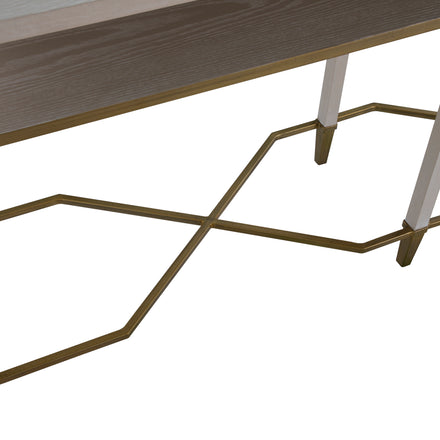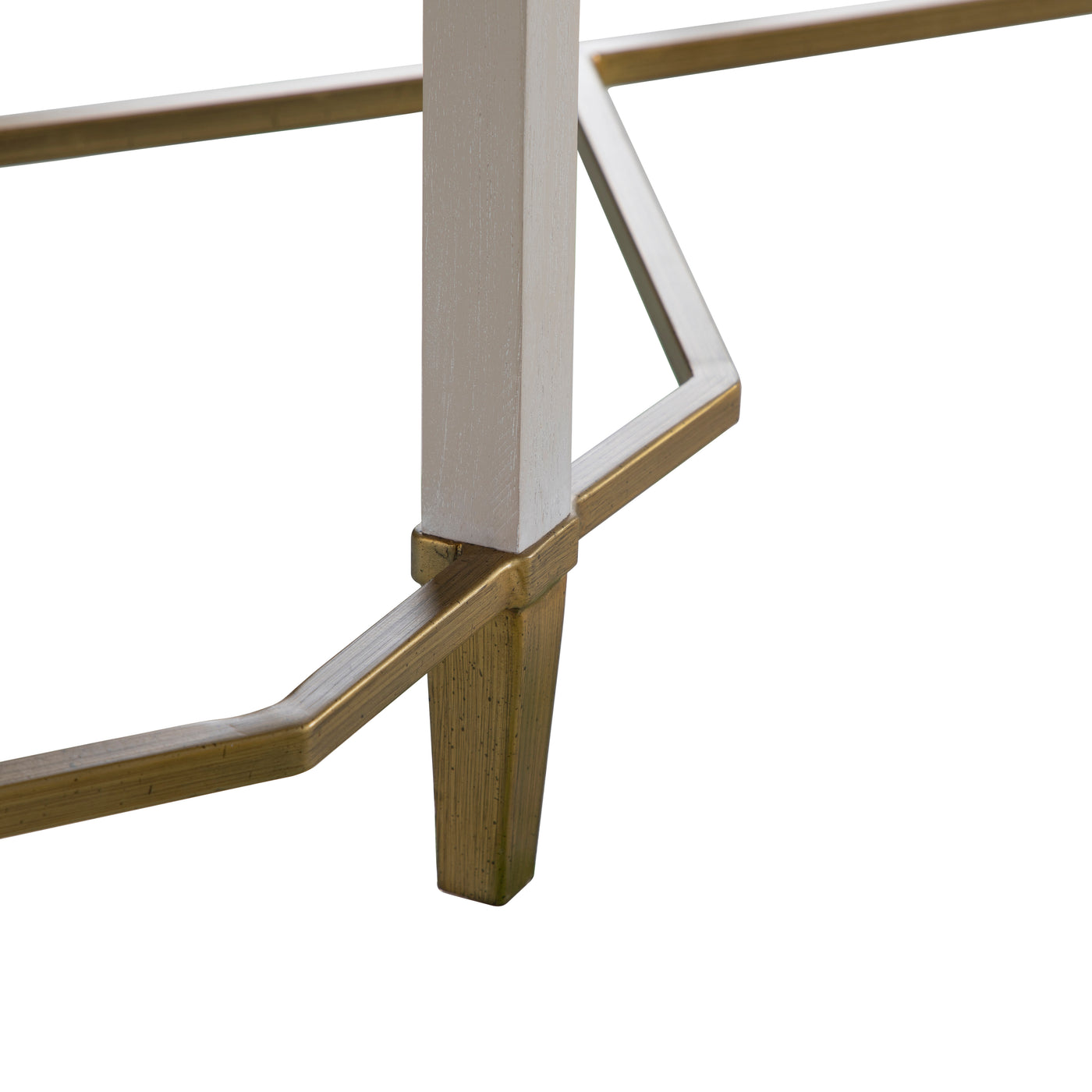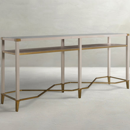 The iconic Sue Console Table is now available in a bright cerused white finish with brushed gold accents, offering a fresh twist on a classic favorite. At 70" long, this elegant console makes a bold statement in entryways, living rooms, or behind sofas. Refined details like metallic corner caps, a sculptural chain link stretcher, and tapered legs bring sophistication and structure to any space.