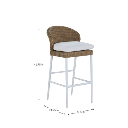 The Dune Barstool brings elevated coastal charm to outdoor dining and entertaining. Featuring a gently curved back and low-profile silhouette, it’s crafted with handwoven N-Dura™ resin wicker in a warm natural rattan finish. The sleek, powder-coated wrought aluminum frame in our Chalk finish provides a crisp contrast and lasting durability in saltwater and high-UV environments. Lightweight and comfortable, it’s ideal for outdoor bars, balconies, and raised dining spaces.