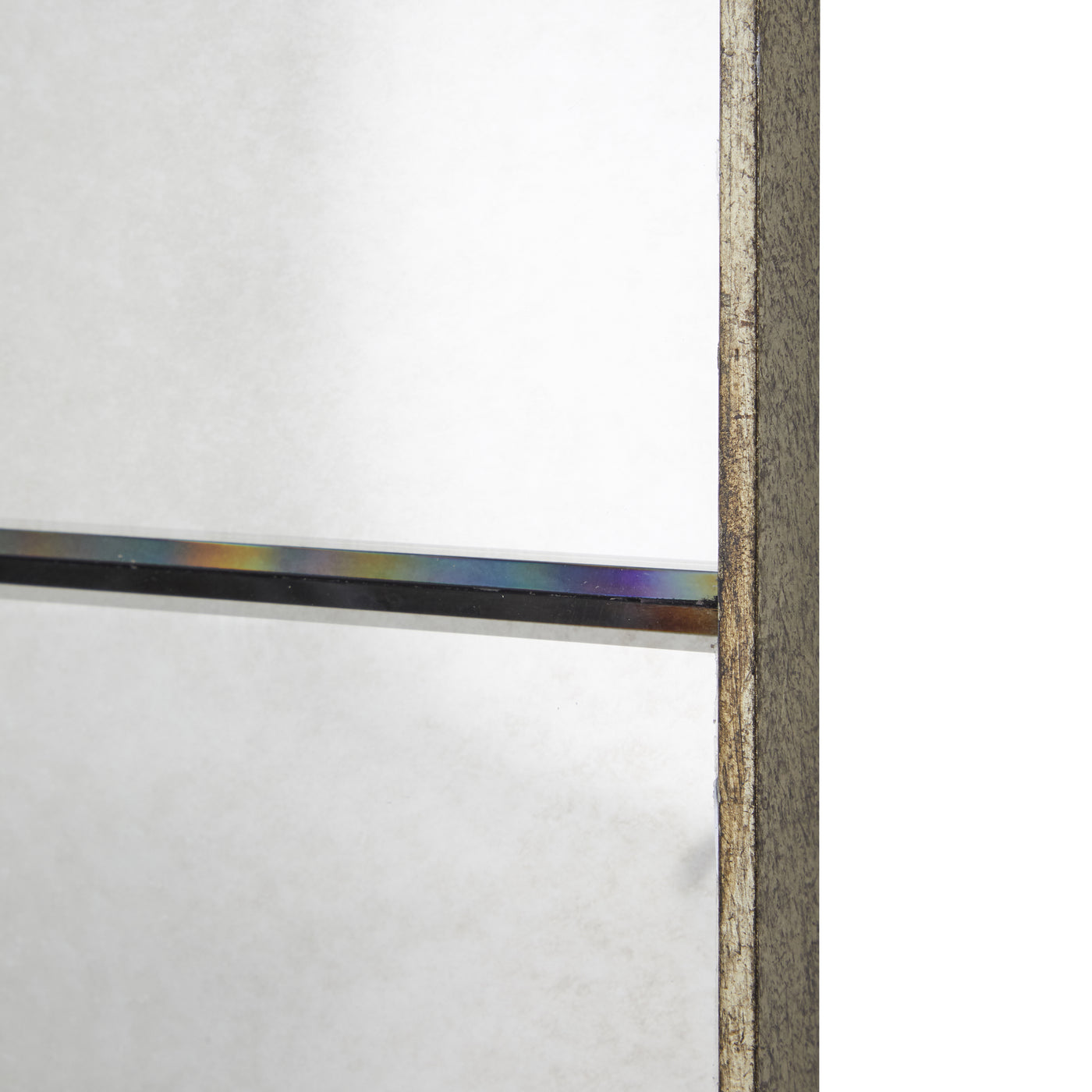 - Two large beveled antique mirror panels enhance depth and reduce distortion