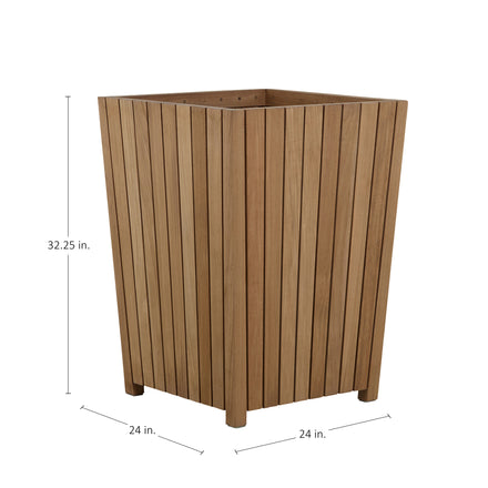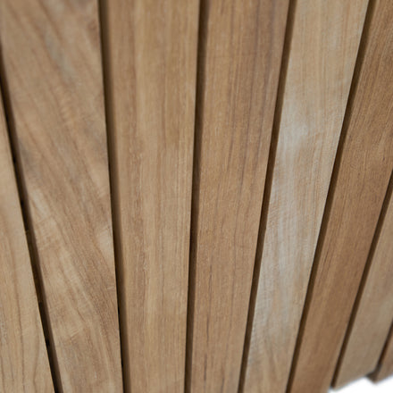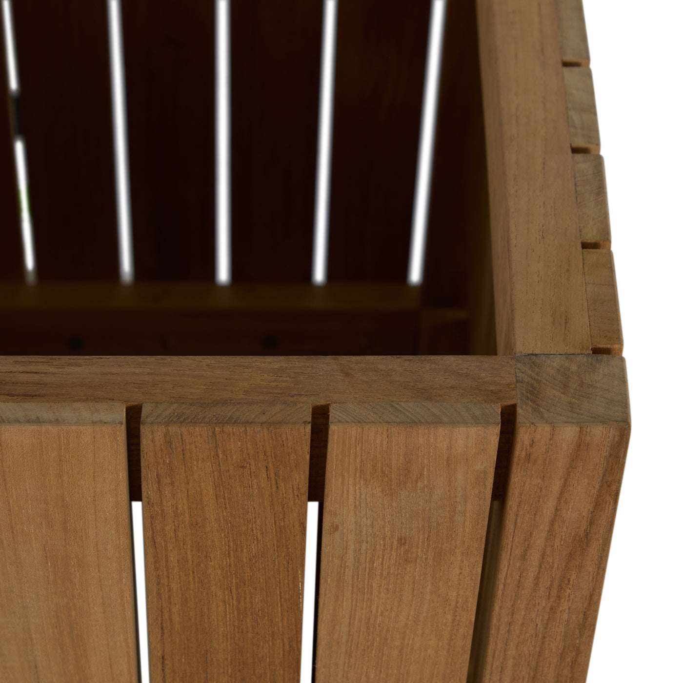 Bring a bold, organic element to your outdoor spaces with the Woodlawn Teak Extra Large Planter. Crafted from sustainably sourced Grade A teak, this planter showcases clean lines and vertical slats that echo the collection’s refined simplicity. Its generous size makes it ideal for statement greenery or small trees, while the warm wood tone complements both classic and contemporary settings. Built with a drainage hole at the bottom for practical use, it’s a durable and elegant solution for stylish planting. Over time, the teak will naturally develop a soft silver patina, adding to its timeless appeal.