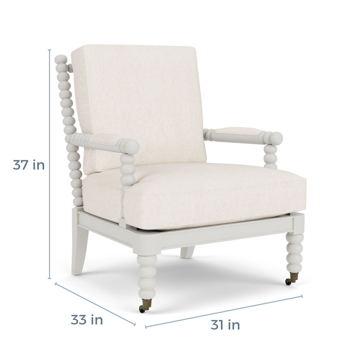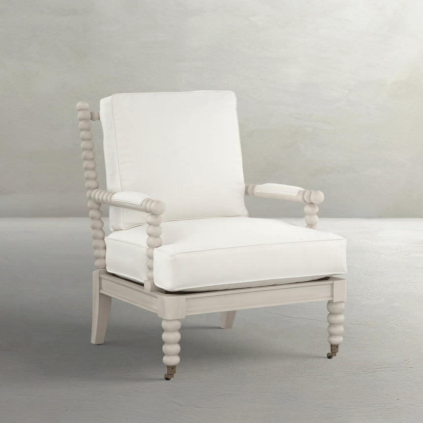 Inspired by the English rural style “bobbin” technique, the Pierce Chair delights with its turned wood spool design. Boxed cushions and padded armrests make this traditional style chair a stylish place for comfortable seating, and its unique styling ups the charm. Pair with the matching Pierce Ottoman to complete the look.