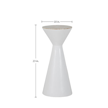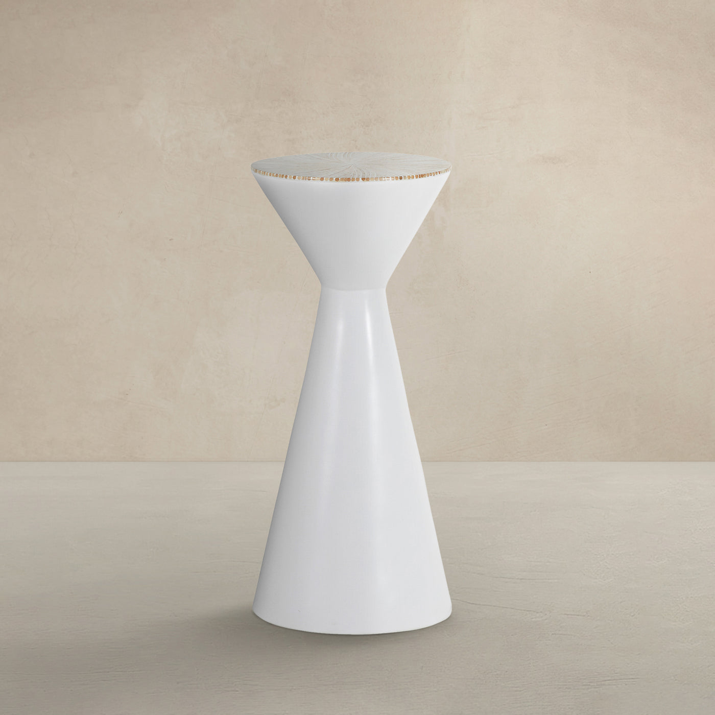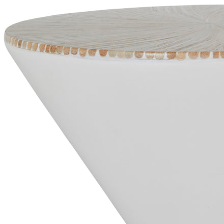 The Essie Drinking Table showcases a fusion of contemporary form and traditional materials. Its sleek white base contrasts beautifully with the textured rattan veneer top, inviting a touch of tactile warmth to any modern space. The bright white cone-shaped base and warm-hued tabletop instantly bring to mind a beach house vibe, but this table's cool good looks and diminutive size make it a handy piece that's easy to mix with any mood.