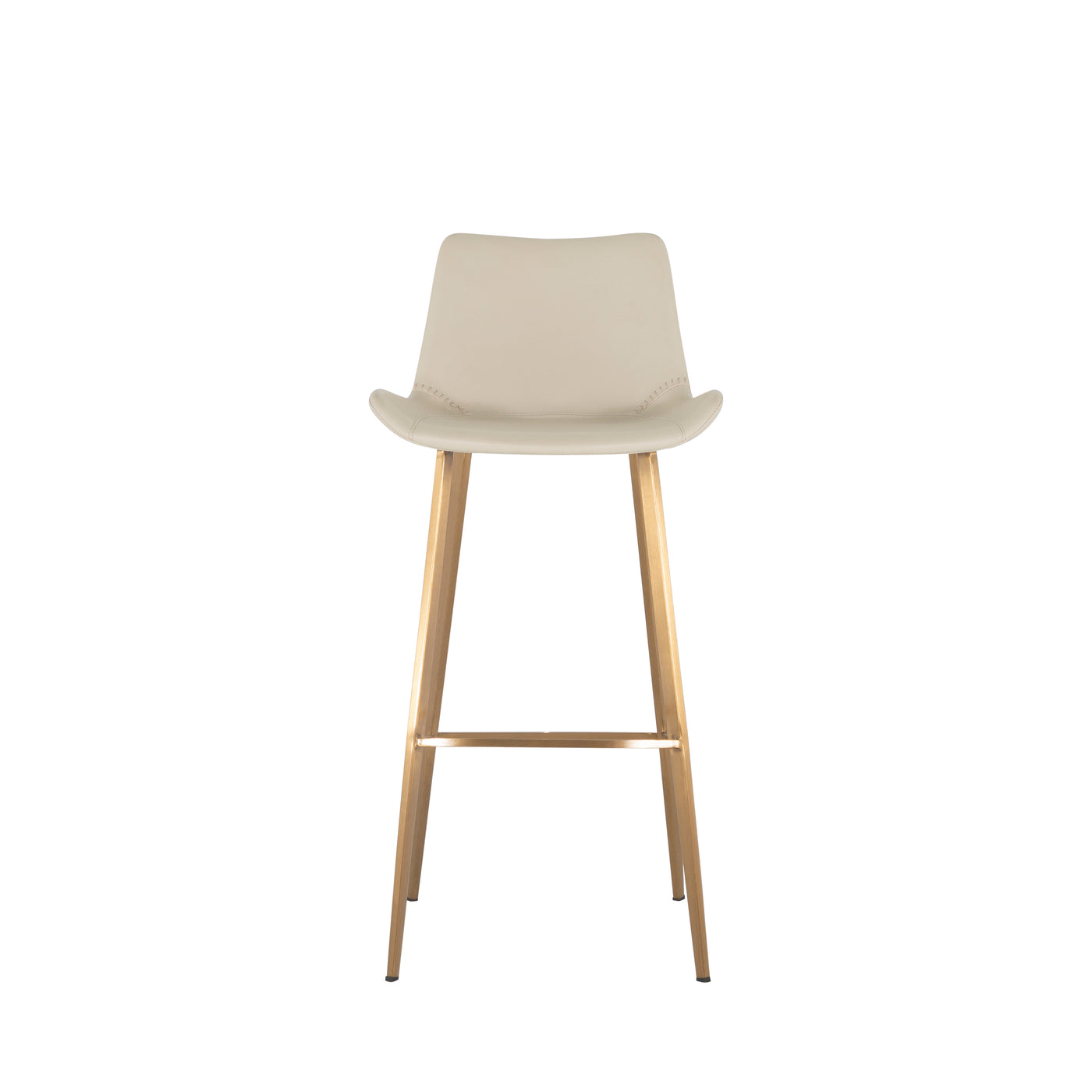 The Hines Bar Height Stool is a stylish and comfortable addition to any kitchen or bar area. Upholstered in an elegant white faux leather, it offers a rich, sophisticated look that's easy to maintain. The iron legs, finished in stainless gold, provides a sophisticated transition and touch of modern elegance. With its ergonomic design, this stool ensures comfort, making it perfect for extended use. Durable and versatile, the Hines Bar Height Stool complements a variety of interior styles, from contemporary to industrial chic. Also available in a dark brown.