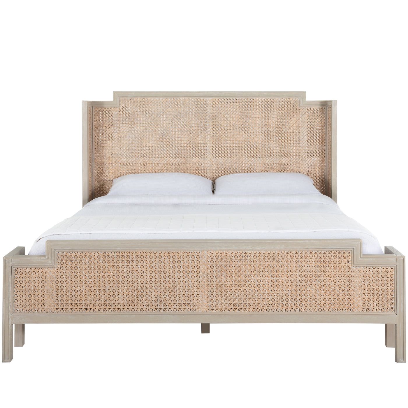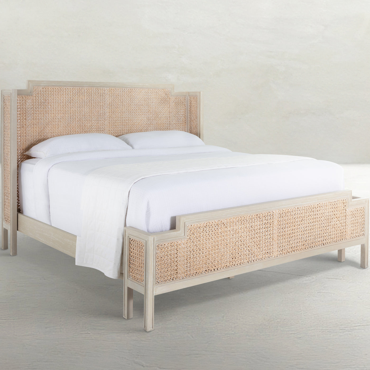 The Camille King Bed introduces Gabby's first foray into cane furniture design, bringing a fresh and airy aesthetic to the bedroom. Framed in shaped wood with rich, light natural rattan panels, this bed exudes relaxed sophistication. The winged headboard and footboard add a cozy, enclosed feel, perfect for both casual and elevated décors. Its transitional style makes it a versatile piece that complements various interior themes, particularly coastal-inspired spaces. The light natural rattan and cerused white finish evoke the breezy, calming feel of seaside living, making this bed ideal for a coastal design. Available in both Queen and King sizes, the Camille Bed blends wood, mahogany, and metal accents, offering an inviting bedroom centerpiece that embraces the laid-back elegance of coastal style.