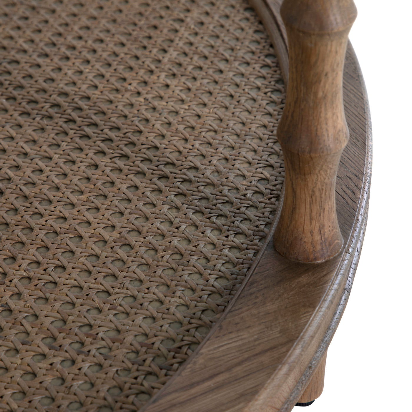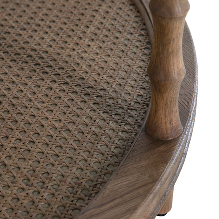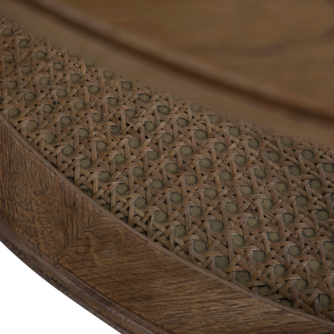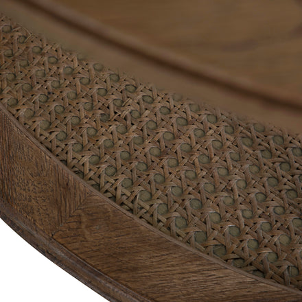 The Sabine Coffee Table blends classic charm with light, airy elegance. Crafted from solid oak in a natural satin finish, this 36" round table features a tempered glass top that offers a clear view of its beautifully woven cane lower shelf - perfect for displaying books, décor, or keeping essentials close at hand. Turned wood supports add a traditional touch, while the mix of textures - glass, oak, and cane - creates a layered, organic feel that suits a variety of interior styles.