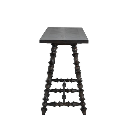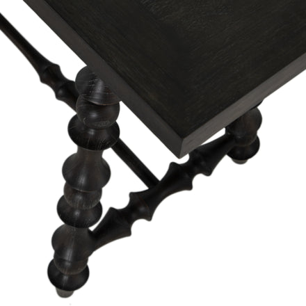 The Kirkwood Console Table is a modern interpretation of the Jacobean antique spindle design, featuring intricately turned legs that add a touch of classic elegance to any space. Available in both cerused forest black and cerused natural finishes, this console table is made from high-quality Mindi wood and features an angled veneer pattern on the tabletop, giving it a contemporary edge. Whether placed in an entryway, living room, or dining area, the Kirkwood Console Table offers a stylish and timeless addition to your decor, blending old-world charm with modern craftsmanship.