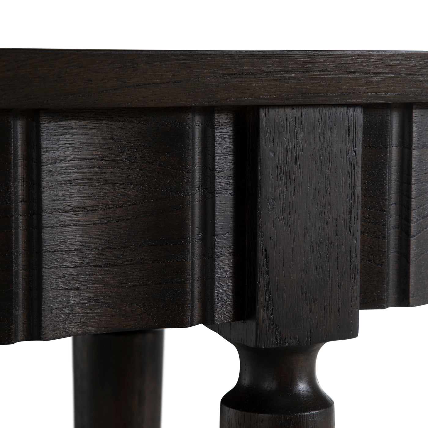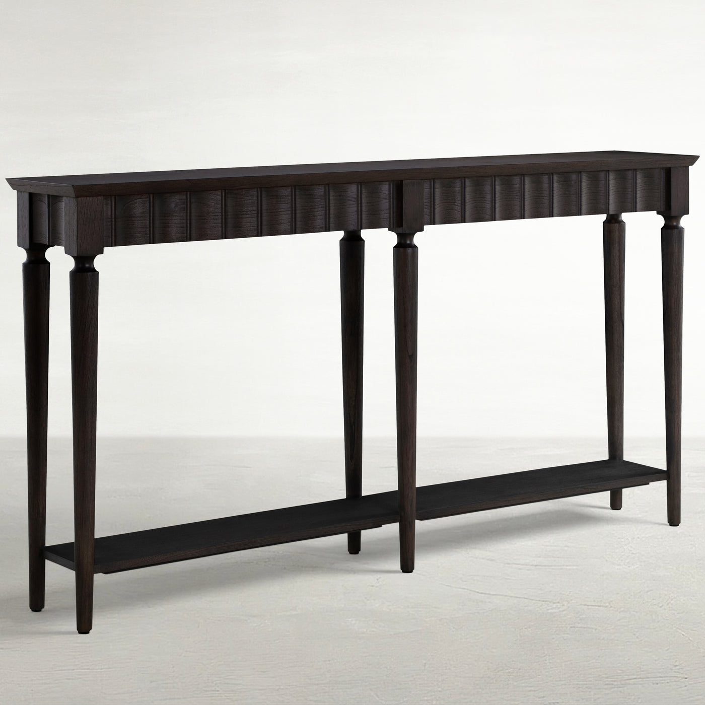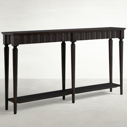 The Long Peterson Console offers a sleek, elongated design perfect for narrow spaces, such as hallways or entryways. Crafted from durable Mindi wood in a dark finish, this console features a distinctive ribbed detailing along the apron and slim, turned legs, giving it a refined yet understated appearance. A lower storage shelf adds functionality while maintaining the table's slim profile, making it an ideal filler piece that provides both style and utility in any space.