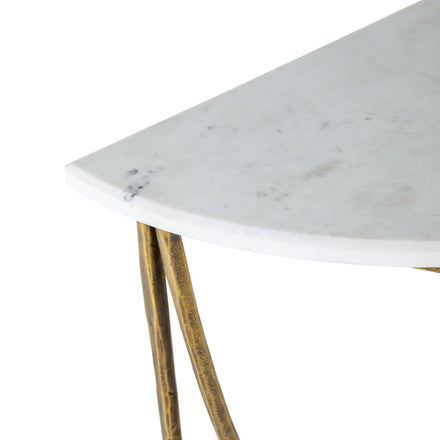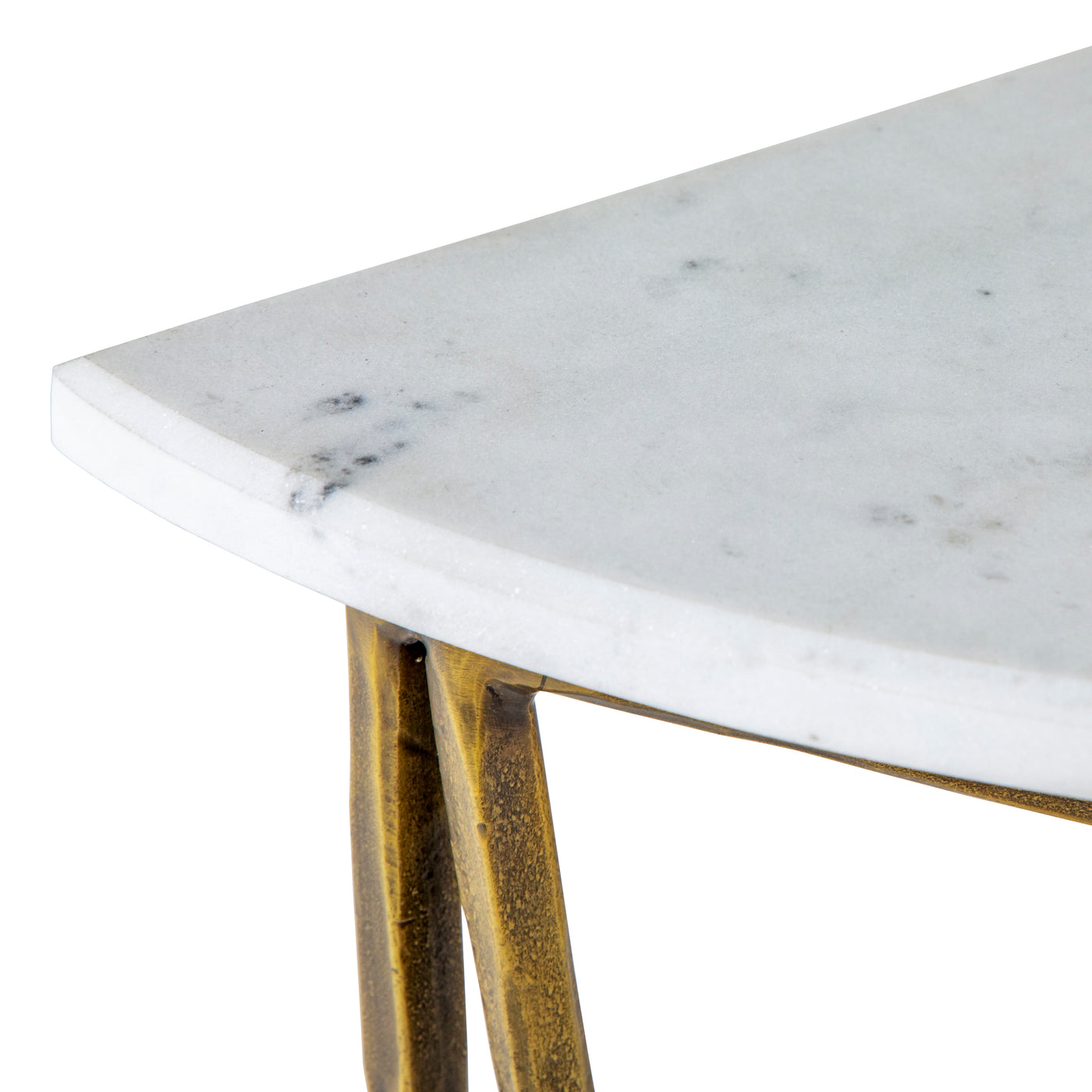 The stunning Wayland Console Table exudes modern elegance and classic sophistication. Featuring a graceful, semi-circular shape with an intricate metal base, inspired by art deco designs, this console is perfect for entryways, living rooms, or hallways. Its topped by White Banswara Marble, originating from Rajasthan, India, which is renowned for its pristine white color with subtle Gray or purple veining. This product uses natural or handmade materials, so variations in color and pattern are to be expected and celebrated.