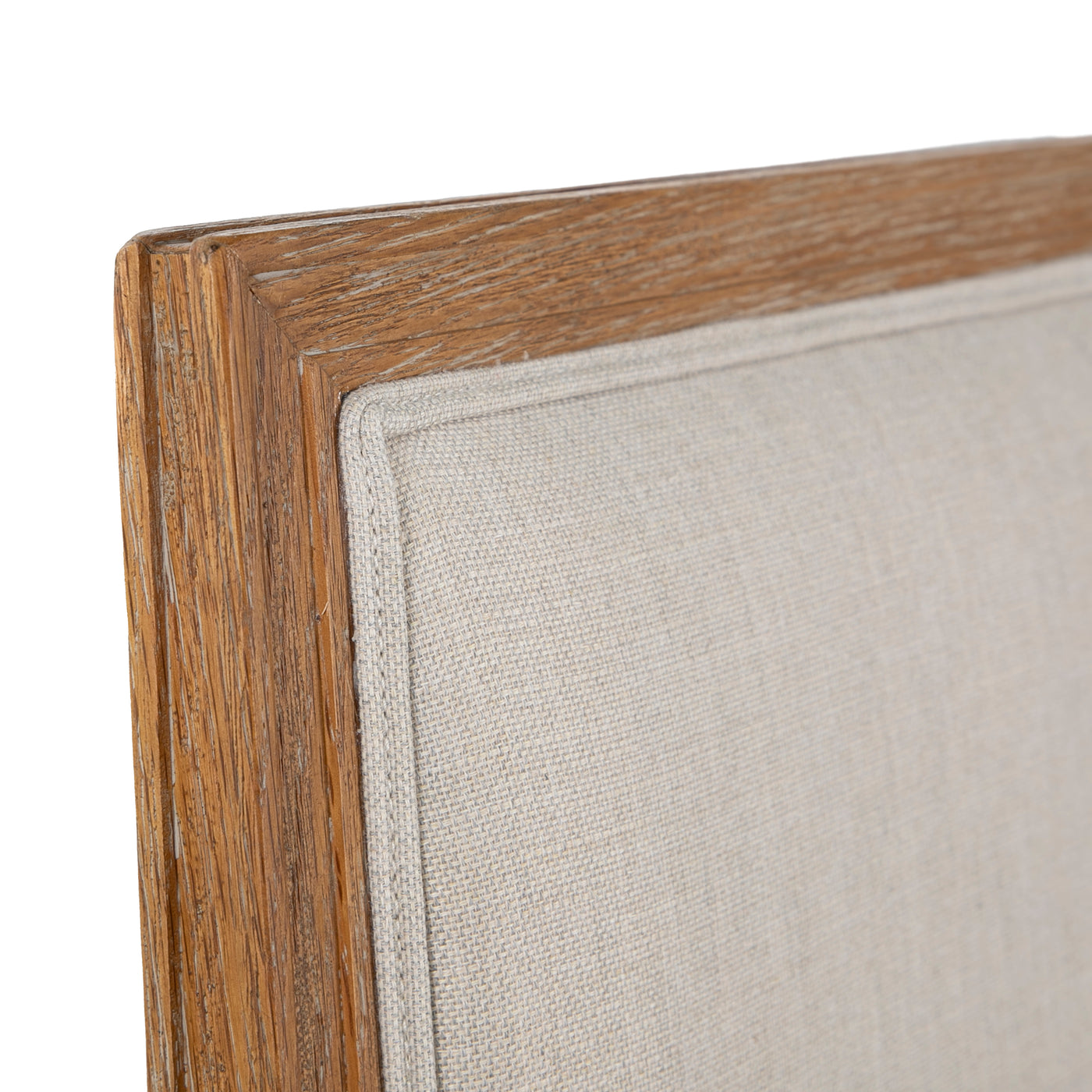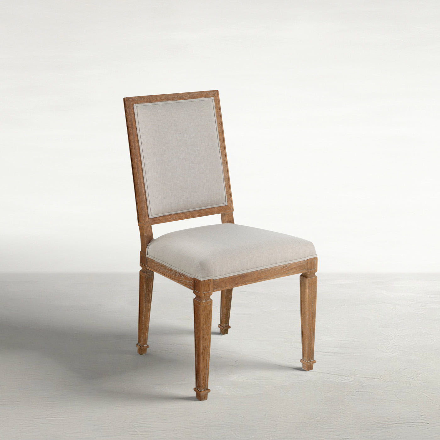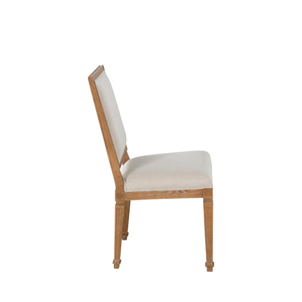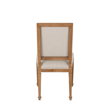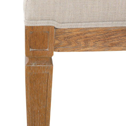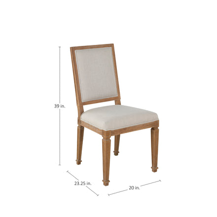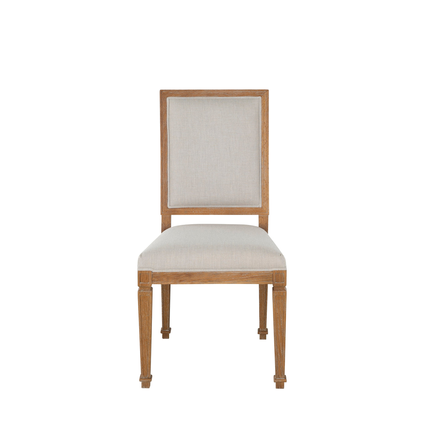 The Danielle Dining Chair brings the simplicity and vintage charm back to the dining room. It features a classic square back with elegant inset performance upholstery, perfectly blending with transitional dining tables. Crafted from sturdy oak and finished in a pecan finish, this side chair is upholstered in a neutral Sunbrella Linen Dove fabric, ensuring both style and durability.