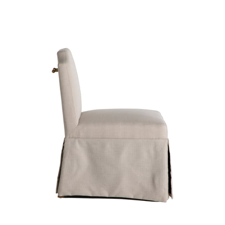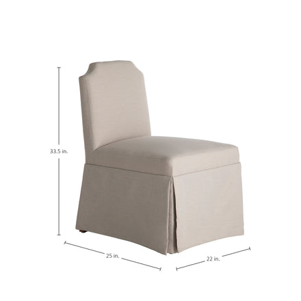 The classic silhouette of our Edmund Dining Chair is a versatile piece, perfect for your dining table, desk, or vanity. Its elegant, armless profile features notched sides, while the fully skirted base creates a clean and sophisticated look. Upholstered in a durable, easy-care performance fabric, this chair is designed for both style and convenience. The plush cushioning provides comfort, supported by a sturdy wood frame for lasting quality. A functional handle on the back adds a practical touch, making the Edmund Dining Chair a timeless addition to any room.