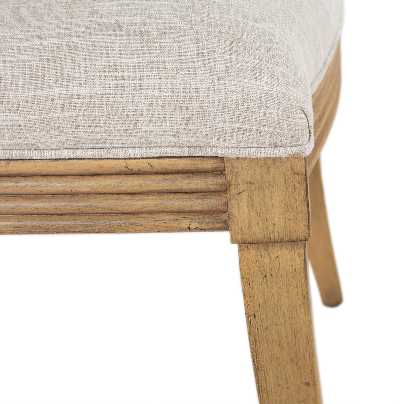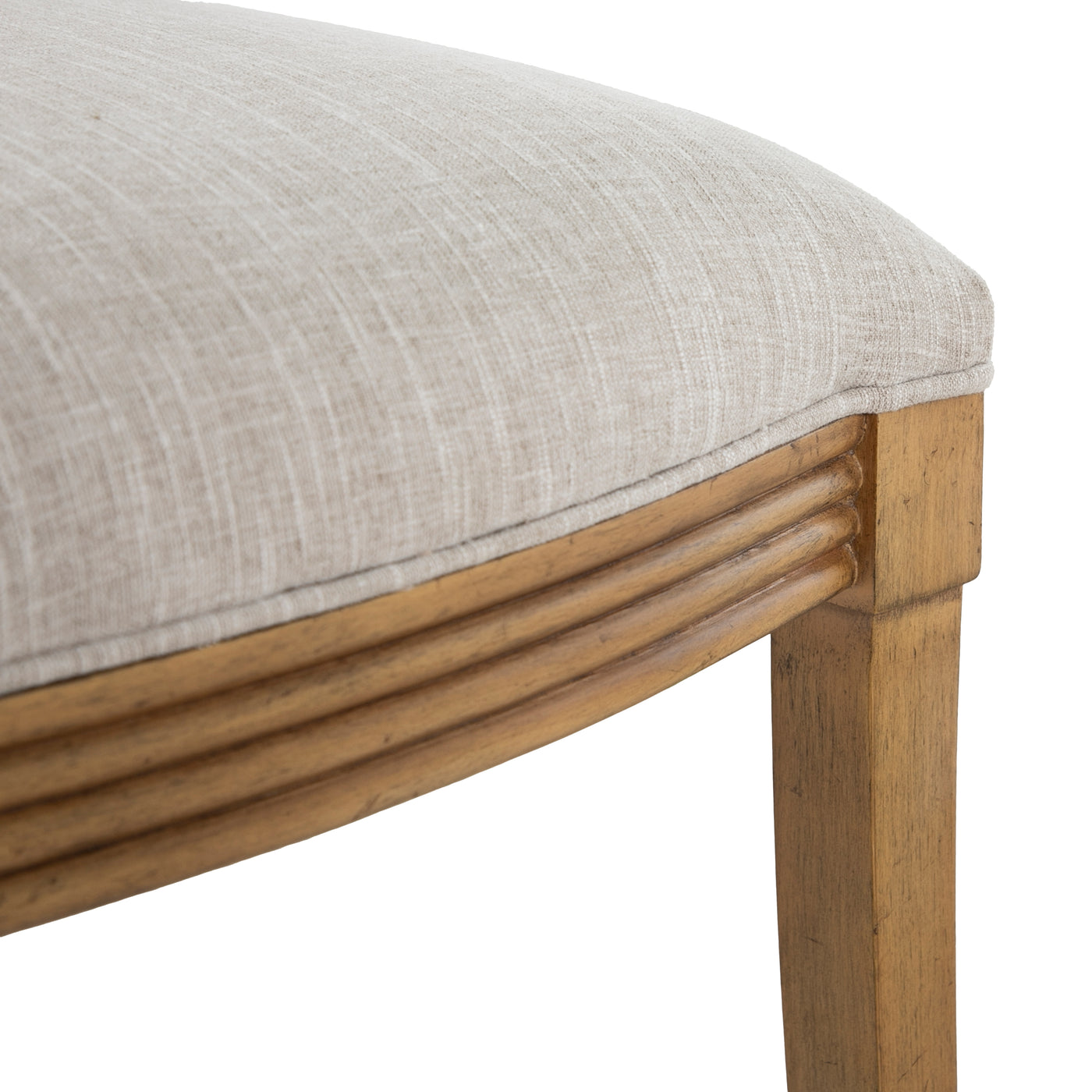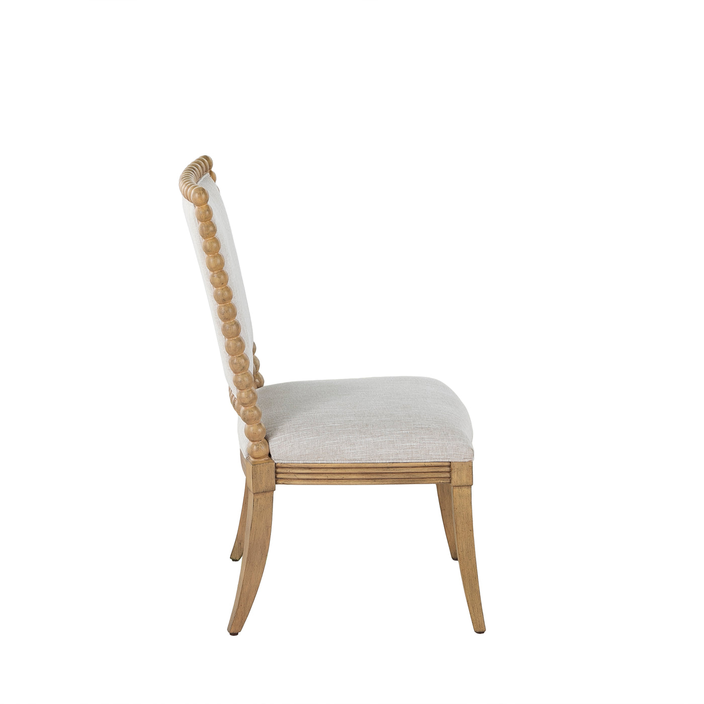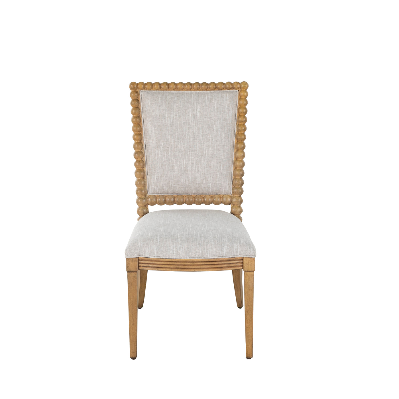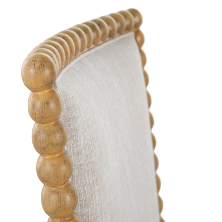 Featuring a carved bobbin-style frame in a rustic French Oak stain, the Knox Dining Chair adds personality and warmth to any dining space. The seat and back are upholstered in Strai Sand, a high-performance fabric designed to resist spills and stains while offering a soft, refined texture.