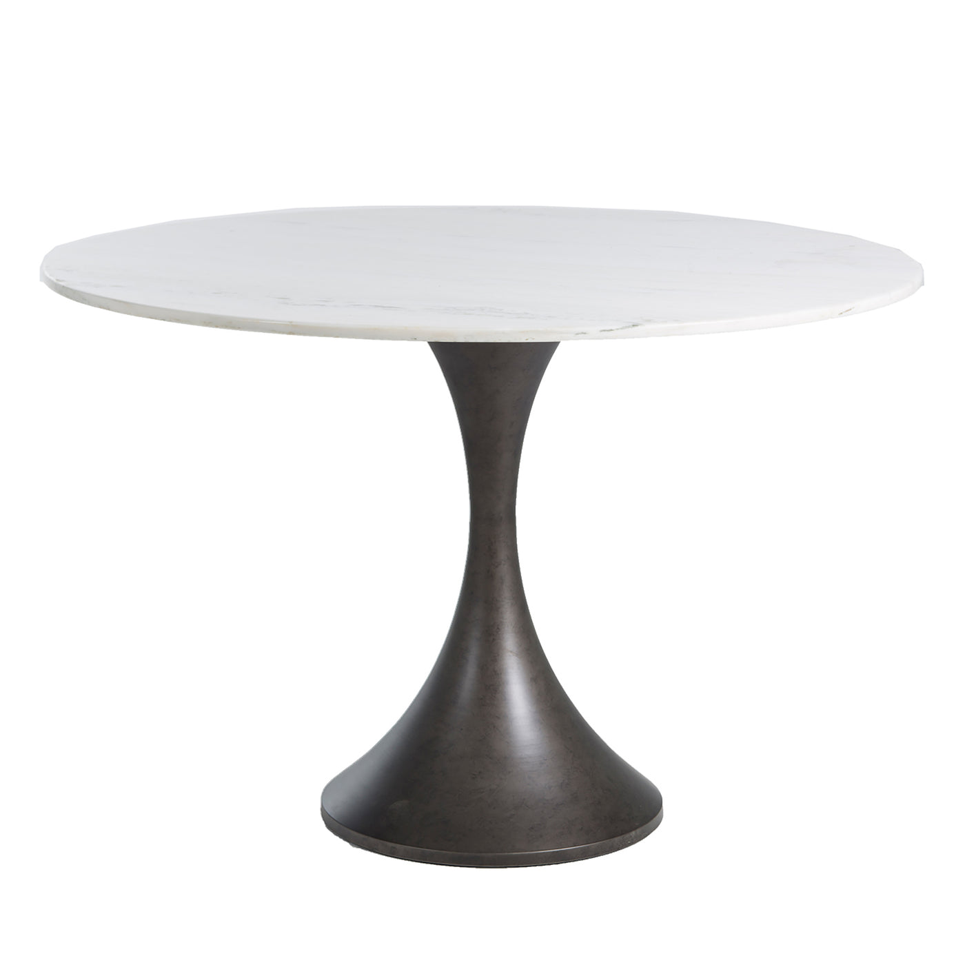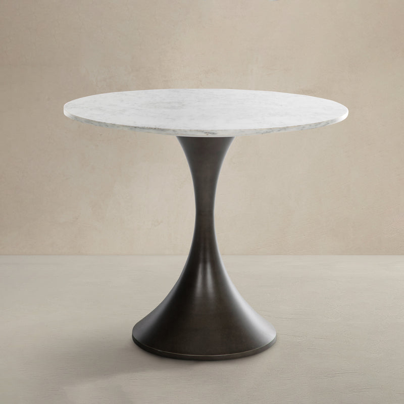 The Cortez Breakfast Table brings a mid-century modern flair to your dining area with its striking two-tone design. The sweeping metal hourglass base, finished in a mottled burnished bronze, provides a sturdy yet elegant foundation. Topped with a 48-inch round white and gold flecked marble surface, this table comfortably seats four to six people. As marble is a natural material, each table features unique variations, adding to its charm and distinctiveness.
