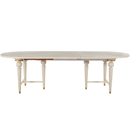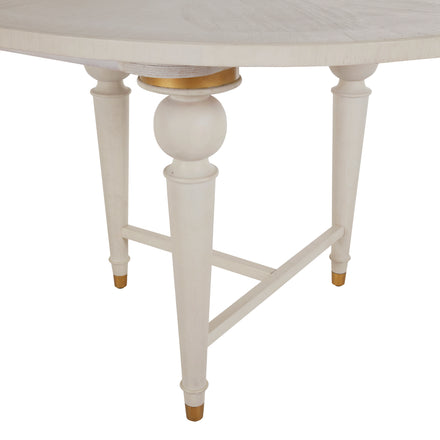 The Rosemary Dining Table blends classic design with contemporary elegance, featuring a cerused white finish with refined brass accents. Its beautifully turned legs and metal accents make this a sophisticated piece and a perfect addition to any dining space, offering both functionality and aesthetic appeal. The Rosemary Dining Table is designed to complement a variety of interior styles, including coastal, providing a versatile and stylish centerpiece for your dining room.
