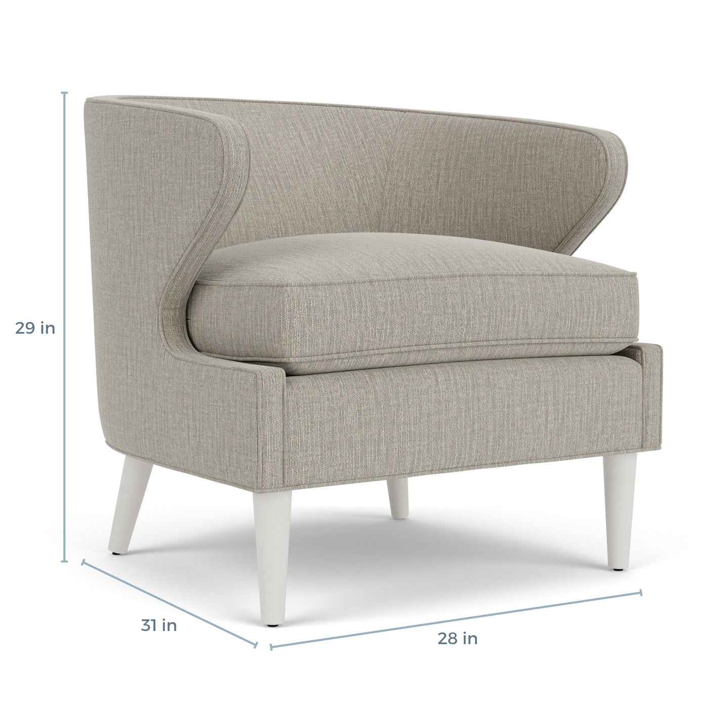 With its mid-century inspired rounded back, the Monroe Chair surrounds with comfort. A low back, smooth rounded arms, and sleek tapered legs give this chair its distinctive style that makes an appealing accent whether in a living room or bedroom setting. Nailhead trim and self welting along the seams add handsome and optional tailored detailing. Also available in a swivel option.