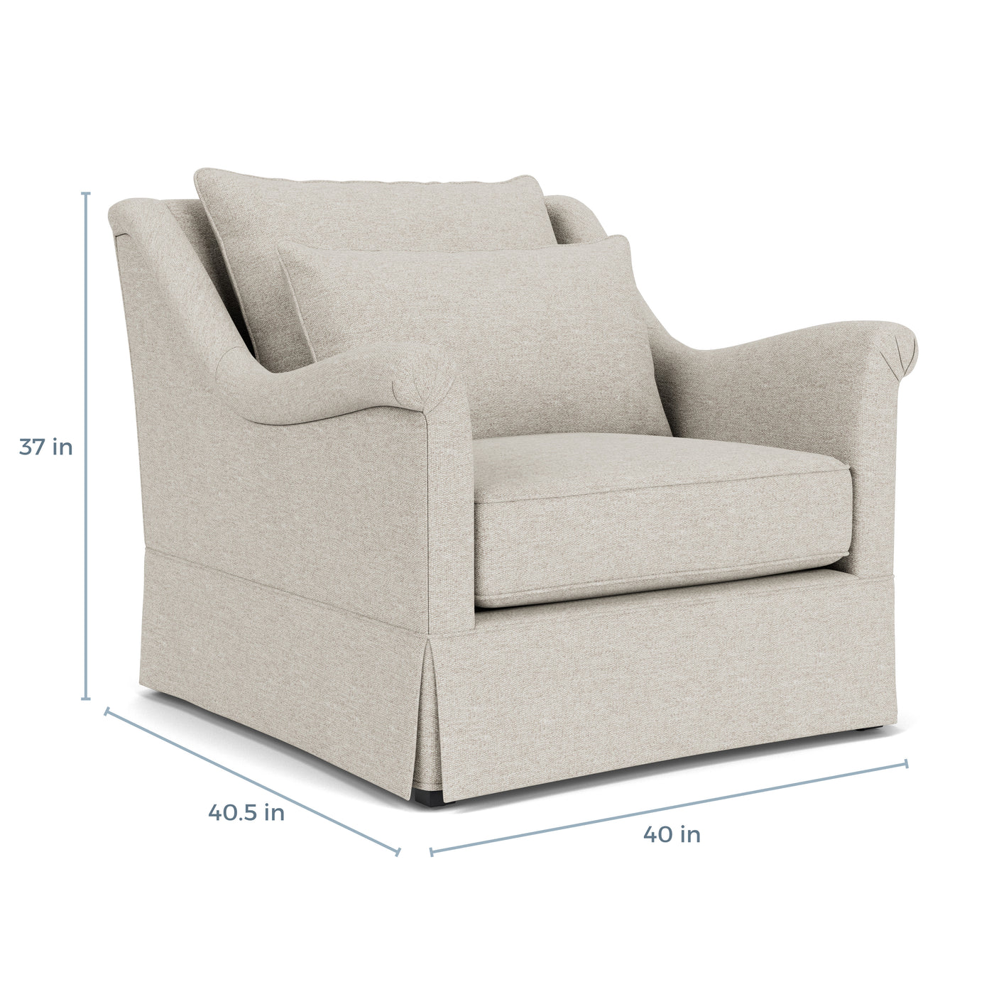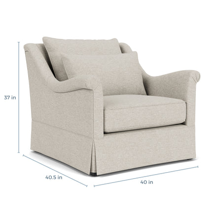 The Winslow Chair & 1/2 expands on the celebrated comfort and feminine elegance of the Winslow collection, offering the widest seating in our lineup, affectionately known as "a chair and a half". Handcrafted in North Carolina, it features the collection's signature deep seating, graceful curves, and a tightly upholstered, skirted frame, providing a stylish sanctuary. This generously proportioned chair, complete with a kidney pillow for added support, perfectly blends classic allure with modern comfort, making it a luxurious addition to any space.