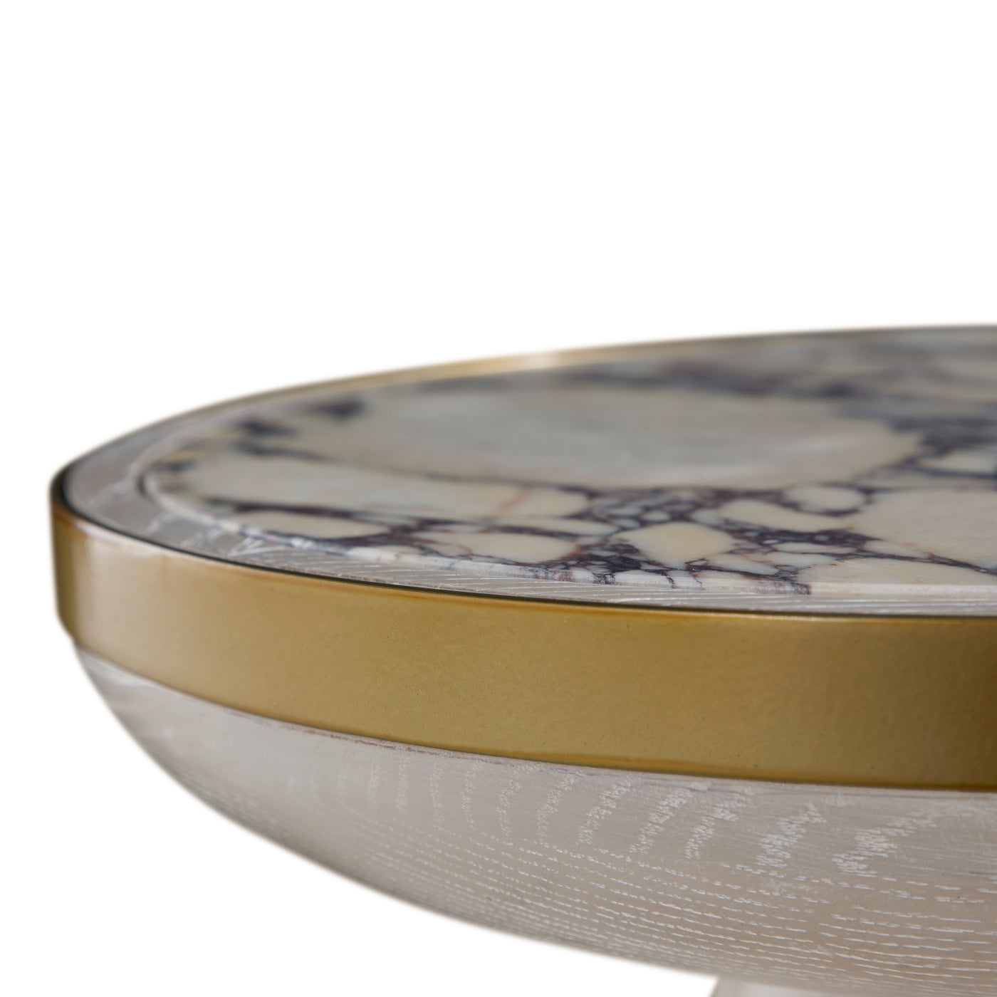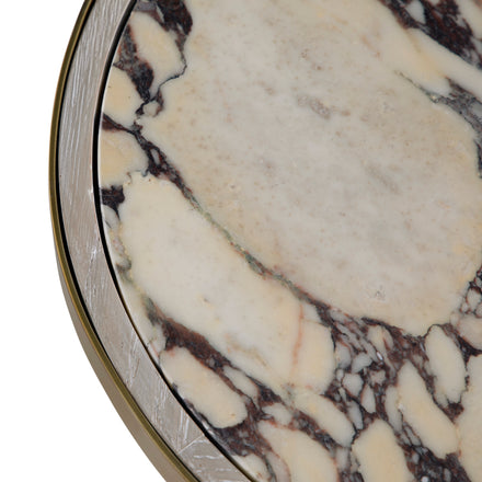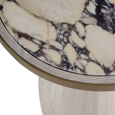 The Cain Side Table in White Cerused Oak is a masterpiece of modern Italian elegance. Topped with exquisite Calcutta Viola marble, its soft white surface is beautifully veined with deep, organic patterns, creating a striking yet refined aesthetic. The antique brass band encircling the edge adds a touch of timeless glamour, while the sculptural base in a genuine white cerused oak veneer brings warmth and sophistication. A true fusion of natural beauty and contemporary design, this table is a statement of effortless luxury for the stylish home.